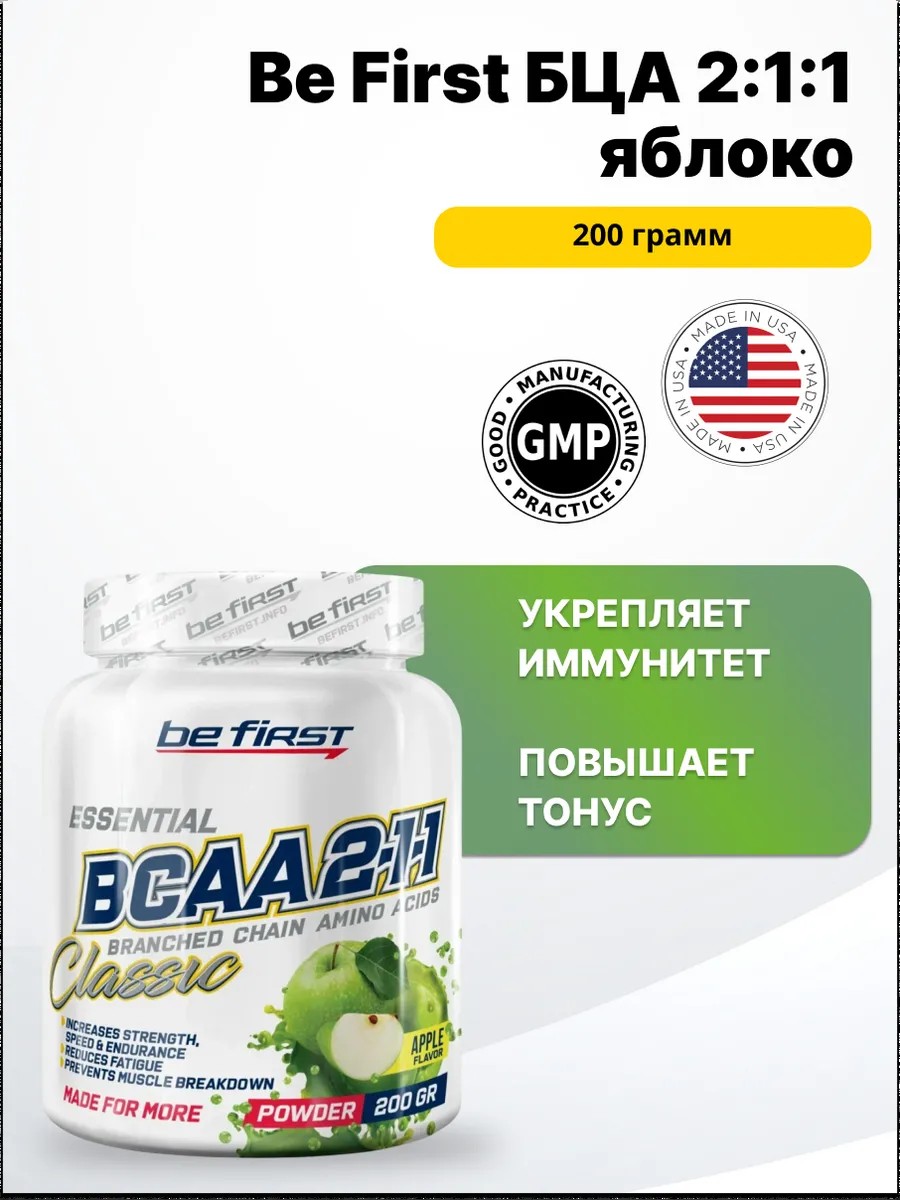 Be First БЦА 2:1:1 Powder - аминокислотный комплекс, включающий в себя 3 незаменимые аминокислоты: L-лейцин, L-изолейцин, L-валин в наилучшем классическом соотношении 2:1:1. Продукт производится с применением ингредиентов, не содержащих в составе добавки для улучшения растворимости (также у нас в ассортименте есть быстрорастворимые (INSTANT) БЦА 4:1:1 и 8:1:1). Продукт разработан при участии специалистов мирового уровня в области спортивного питания и выпускается на предприятии, обладающем международными сертификатами ISO и HACCP. Благодаря профессионально составленной рецептуре и использованию высококачественного сырья, аминокислоты Be First БЦА обладают превосходным вкусом, максимальной эффективностью и наилучшей степенью усвоения организмом. Научно доказано, что прием БЦА способствует: ускорению синтеза белка, достигаемого вследствие повышения количества свободных аминокислот в мышцах, что приводит к стимуляции роста мышечной массы и ускорению процесса восстановления после интенсивных тренировок; снижению процента жира в организме во время низкоуглеводной диеты; улучшению выносливости и силовых показателей; увеличению выработки инсулина.