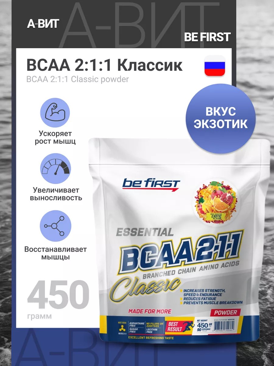 Be First BCAA 2-1-1 CLASSIC Powder is an amino acid supplement consisting of three proteinogenic amino acids, distinguished by the presence of a branched carbon chain: L-leucine, L-isoleucine, L-valine in the best classic ratio of 2:1:1.