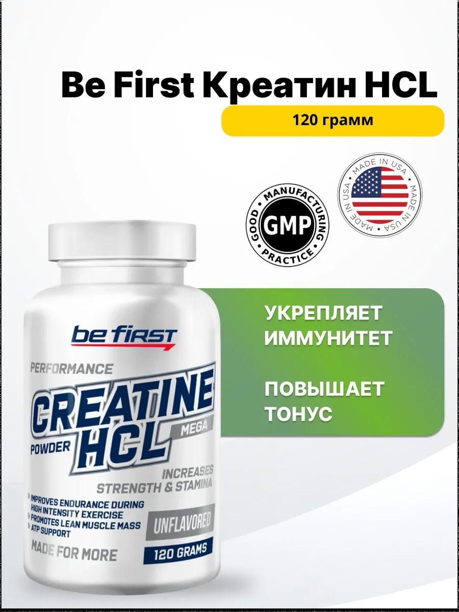 Be First Creatine HCL powder – это высокоэффективная добавка для спортсменов, позволяющая добиться лучших результатов в тренировках, повышая их интенсивность путем более активного снабжения энергией работающих мышц. Продукт Be First Creatine HCL POWDER разработан при участии специалистов мирового уровня в области спортивного питания и произведен в соответствии с мировыми стандартами качества на предприятии, обладающем международными сертификатами ISO и HACCP. Благодаря профессионально составленной рецептуре и использованию высококачественного сырья, Be First Creatine HCL POWDER обладает максимальной эффективностью, наилучшей степенью усвоения организмом. Что такое креатин? Креатин чрезвычайно важен для мышечной ткани, которая и содержит большую часть креатина организма. Один из ключевых источников креатина для человека – красное мясо. Открыл креатин французский исследователь Шеврель в 1832 году, и назвал это вещество именно в честь мяса (kreas – значит мясо). Химия относит креатин к классу алифатических карбоновых кислот с содержанием азота. А по существу, креатин – важная часть энергетического механизма работы мышц. Как действует креатин? Самое важное, для чего требуется креатин – это работа системы энергообеспечения мышечных клеток. Креатин в ней передает фосфатные группы молекулам АДФ, превращая их в АТФ, которая и отдает энергию мышечным волокнам. То есть, говоря проще, креатин обеспечивает регенерацию АТФ, которая снабжает энергией все процессы. И чем больше в клетках креатина (точнее фосфокреатина), тем дольше может работать эта система. Изначально, в клетках имеется какое-то количество АТФ, фосфокреатина, гликогена и т. д. В первые моменты, когда мышечным волокнам поступает сигнал сокращаться, АТФ отдает им энергию и превращается в АДФ. Запасов АТФ хватает примерно на пару секунд работы мышц. Дальше подключается фосфагенный механизм: молекулы фосфокреатина отдают фосфатные группы АДФ, восстанавливая их до АТФ и те снова снабжают мышечные волокна энергией