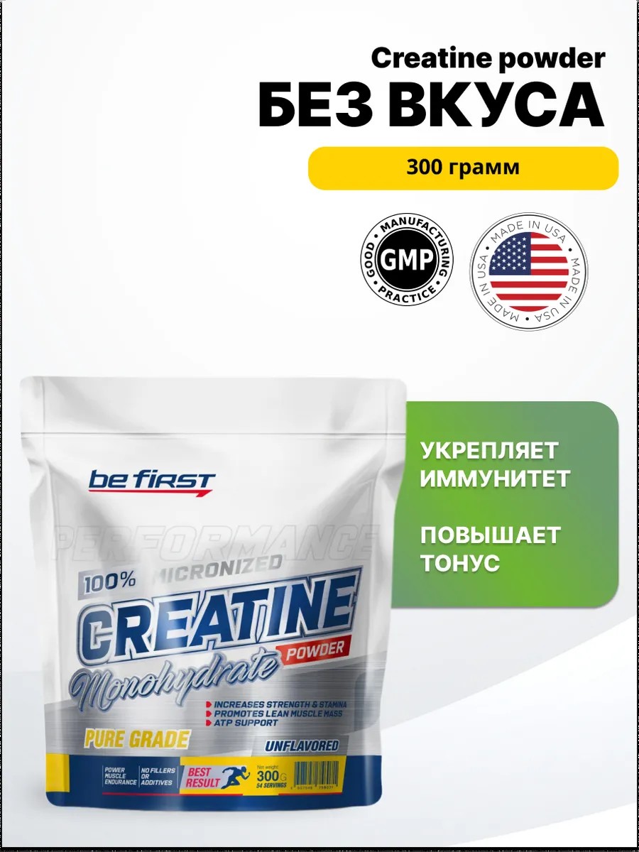 Creatine Micronized Powder Be First произведен с применением технологии микронизации, позволяющей получить измельченный порошок, частицы которого в 20 раз меньше, чем в стандартных продуктах, благодаря чему креатин проще растворяется в воде и лучше усваивается организмом, обладая наибольшей эффективностью. Продукт выпускается в соответствии с мировыми стандартами качества на предприятии, обладающем международными сертификатами ISO и HACCP. Моногидрат креатина играет важную роль в процессах энергетического обмена, происходящих в мышечных и нервных клетках. В организме креатин преобразуется в креатинфосфат, который ускоряет регенерацию АТФ (аденозинтрифосфата), служащего основным источником энергии многочисленных биохимических процессов в организме. Научно доказано, что увеличение запасов креатинфосфата в организме, благодаря приему моногидрата креатина, приводит к увеличению энергетического потенциала мышц, что позволяет тренироваться с большими весами и интенсивностью.