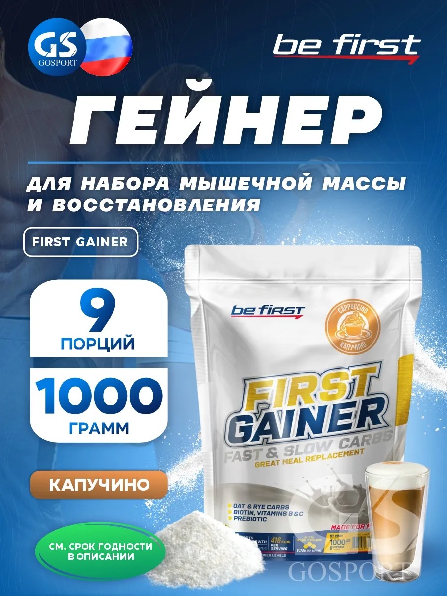 Годен до 02.04.2026. Гейнер First Gainer 1000 г, Капучино. Перед вами уникальное спортивное питание для наращивания мышечной массы - Be First, First Gainer! Этот гейнер - идеальное решение для тех, кто стремится к максимальному набору массы и увеличению мышечного объема. Что делает Be First, First Gainer особенным? Во-первых, смесь Be First, First Gainer содержит оптимальное соотношение белка и углеводов. Белково-углеводная композиция позволяет эффективно поддерживать истощенные после тренировок мышцы и способствует восстановлению организма. Каждая порция этого гейнера содержит высококачественный сывороточный протеин - основной строительный материал для новых мышц. Благодаря быстрому усвоению сывороточного протеина Be First, First Gainer дает вашим мышцам необходимое питание сразу после интенсивных тренировок. Однако, успех в наборе мышечной массы не ограничивается только белком. Углеводы играют ключевую роль в обеспечении организма энергией, необходимой для выполнения силовых тренировок и увеличения физической выносливости. Be First, First Gainer богат углеводами, что позволяет эффективно поддерживать силовые тренировки и обеспечивать организм энергией на весь день. Кроме того, Be First, First Gainer обогащен комплексом питательных веществ, необходимых для укрепления иммунной системы и поддержания общего здоровья. Этот гейнер включает в себя витамины, которые помогают улучшить общее физическое и психическое состояние. Be First, First Gainer имеет превосходный вкус, что делает его идеальным спортивным питанием для каждого. Сочетание нежной текстуры и приятного аромата превратят употребление этого гейнера в настоящий праздник для ваших вкусовых рецепторов. Мы предлагаем как разовую покупку, так и подписку на этот продукт, чтобы обеспечить вас непрерывным спортивным питанием для достижения ваших фитнес-целей. Be First, First Gainer - это спортивное питание профессионального уровня, предоставляющее все необходимые компоненты для успешного наращивания мышечной массы и достижения ваших спортивных результатов. Не упустите возможность стать сильнее и созидать свое лучшее тело с Be First, First Gainer! Смешайте в шейкере 1 порцию (4 мерные ложки) с 250-300 мл молока, воды или любого другого напитка. Принимайте 1-3 порции в день. В дни тренировок рекомендуется принимать одну порцию утром натощак, вторую порцию через час сразу после тренировки. В остальные дни одну порцию в первой половине дня натощак и одну порцию днем натощак.