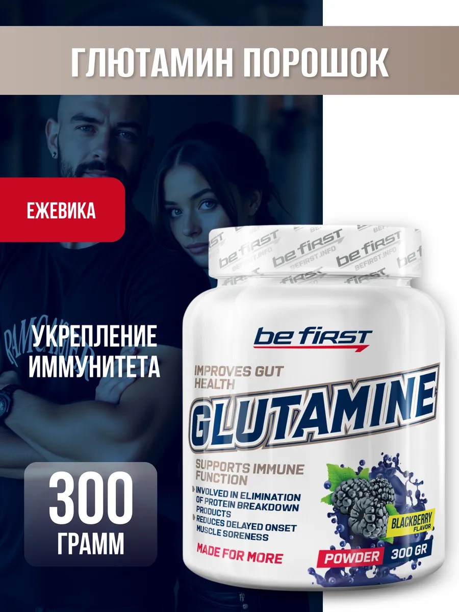 Glutamine Powder 300g from Be First Blackberry-flavored glutamine powder is a powerful supplement containing a proteinogenic amino acid that plays a key role in muscle protein synthesis and immune cell development.