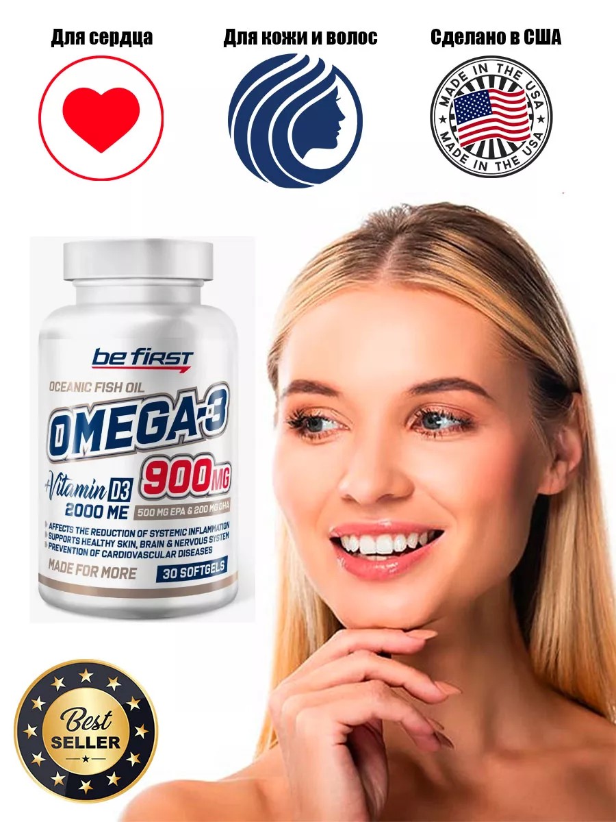 Omega 3 Omega-3 900 mg + Vitamin D3 2000 IU 30 капсул. Рыбий жир Omega-3 900 mg + Vitamin D3 2000 IU от Be First – добавка, сочетающая в себе незаменимые жирные кислоты Омега-3, необходимые для здоровья клеток, и витамин D, отвечающий за укрепление костей и секрецию гормонов. Эйкозапентаеновая кислота (ЭПК) и докозагексаеновая кислота (ДГК) из группы Омега-3 поддерживают нормальную работу нервной и сердечнососудистой систем, снижают вредный холестерин, подавляют воспаления, улучшают интеллектуальные функции. Витамин D укрепляет иммунитет, обеспечивает усвоение кальция костной тканью, поддерживает гормональный фон. Сочетание этих важнейших компонентов помогает сохранять здоровье и жизненную активность, особенно при повышенных спортивных и рабочих нагрузках, а также в периоды сезонных респираторных инфекций. Полиненасыщенные жирные кислоты Омега 3 входят в состав клеточных мембран, поэтому они очень важны для всех процессов в организме. Их прием позволяет сохранить здоровье кожи, суставов, нервной и сосудистой систем. Высокий уровень витамина D3 в диете спортсмена обеспечивает рост спортивных результатов. Витамин Д3 необходим для роста костей и их минерализации. Совместно с кальцием может помочь предотвратить потерю костной массы у спортсменов, подверженных остеопорозу. БАД Omega 3 900 mg + Vitamin D3 может стать полезным компонентом профессионального спортивного питания для спортсменов и людей, занимающихся спортом или фитнесом. Продукт для женщин, заботящихся о своем здоровье и красоте. Рекомендации к применению пищевой добавки: взрослым по 1 капсуле 1 раз в день во время еды. Продолжительность приема: 2 месяца. При необходимости прием можно повторить. Противопоказания: индивидуальная непереносимость компонентов продукта. Перед применением рекомендуется проконсультироваться с врачом.