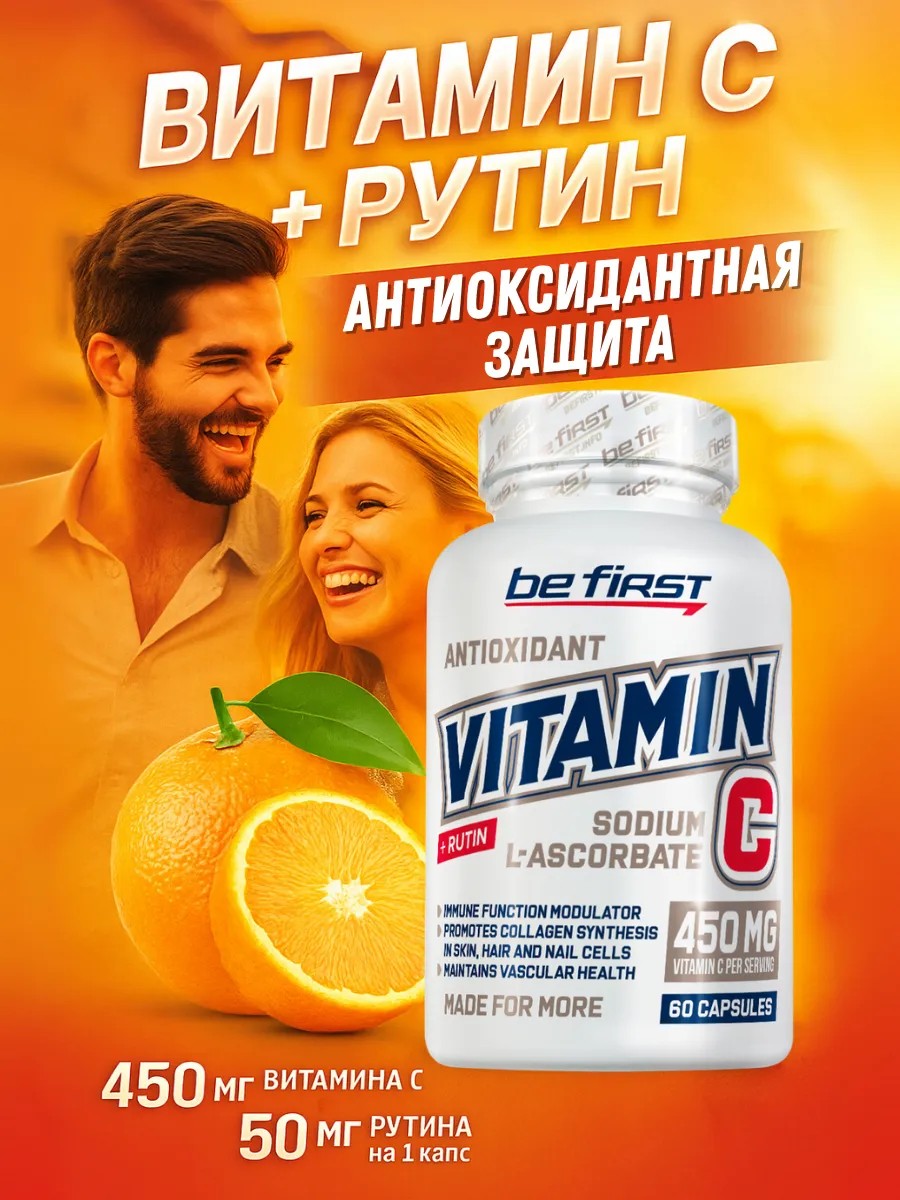 Время остановить этот разрушительный процесс! Be First Vitamin c + Rutin — это Ваш персональный щит против старения и болезней. Каждая из 60 капсул содержит мощную дозу — 450 мг витамина С в легкоусвояемой форме натрия L-аскорбата, которая бережно воздействует на желудок. А рутин в количестве 50 мг на капсулу превращает этот комплекс в настоящее оружие омоложения.