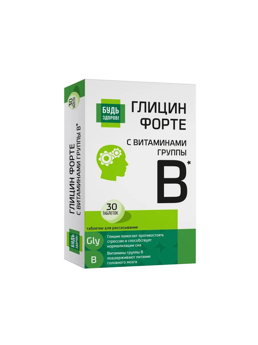 Глицин с витаминами группы В "Будь Здоров!" - в состав комплекса входит аминокислота глицина, которая непосредственно участвует в работе мозга, а также витамины группы В, воздействующие на функциональное состояние нервной системы, способствующие сохранению и правильной работе нервных клеток, снабжению их энергией.