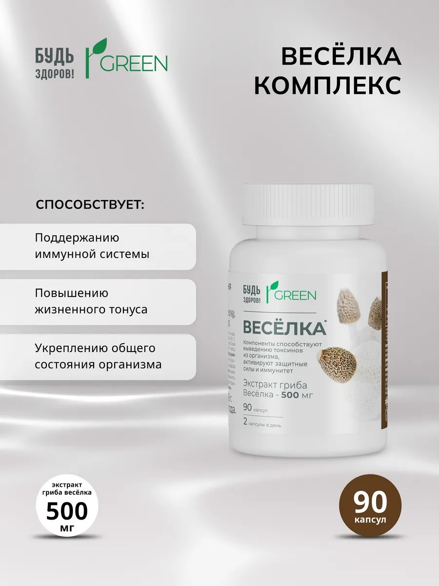 Будь Здоров! Грин Весёлка комплекс капс. №90 - представляет собой съедобный высший гриб, в состав которого входят бета-глюканы, предшественники такого класса углеводов, как полисахариды.