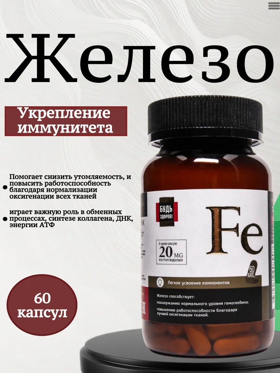 Железо 20 мг Будь Здоров! 60 капсул по 495 мг