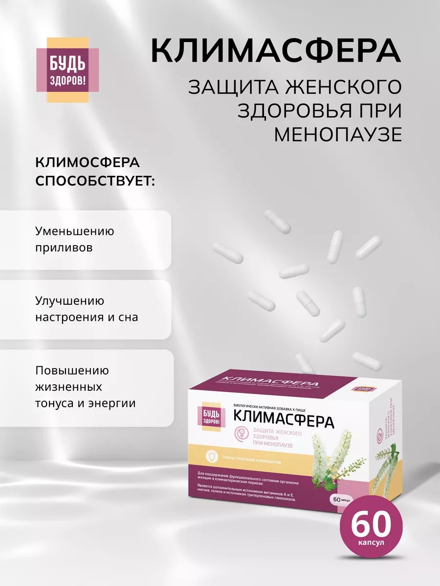 Климасфера "Будь Здоров!" капсулы №60 - рекомендуется для поддержания функционального состояния организма женщин в климактерическом периоде, восстанавливает гормональный баланс организма, укрепляет сосудистую стенку капилляров, улучшая таким образом капиллярное кровообращение и питание тканей, способствует регулированию баланса эстрогенов, оказывая легкое седативное, релаксирующее и спазмолитическое действие.
