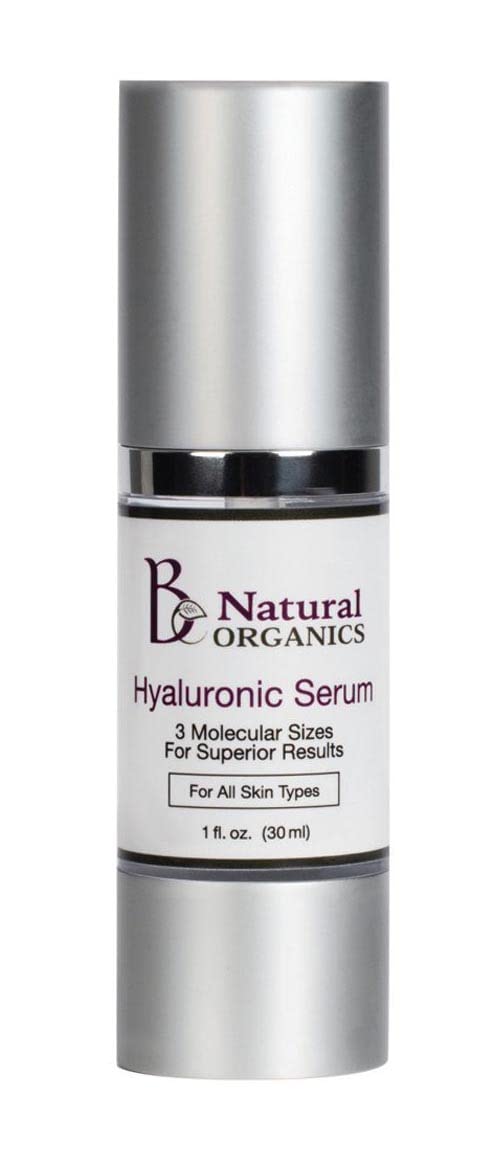 Now EWG VERIFIED, as in The Environmental Working Group's Skin Deep, Hyaluronic Serum provides three different weight molecules of hyaluronic acid to deliver hydration and support to all layers of the skin. As we age our bodies produce much less hyaluronic acid than what is needed for proper balance to help skin keep its youthful appearance. Hyaluronic acid is a natural component responsible for the moisture, firmness and suppleness of our skin. Be Natural Organics Hyaluronic Serum contains three different weight molecules to deliver hydration to all layers of the skin to preserve elasticity and tone. Our serum smooths and plumps which encourages visible lifting effects and reduces the look of dry, fine lines. Hyaluronic Serum's advantages help create the natural hydrated beauty we all associate with youthful looking skin. Low Molecular Weight Hyaluronic Acid – This is the smallest size molecule and can penetrate the deep layers of the skin where normal skin regeneration takes place. It binds to water molecules, pushing them into the lower layers of skin to prevent dehydration. Medium Molecular Weight Hyaluronic Acid – These medium-sized molecules bind more water than the low molecular weight molecules. It can offer a more immediate visual effect on the complexion as it hydrates and softens lines. High Molecular Weight Hyaluronic Acid – This is the largest size molecule which stays on the skins surface and holds the most water (up to 1000 times its weight) giving a moisture surge, smoothing and plumping the skin. Improves the appearance of fine dry lines. NOTE: Our hyaluronic acid is produced through the fermentation of barley and other grains by Bacillus subtilis bacteria.