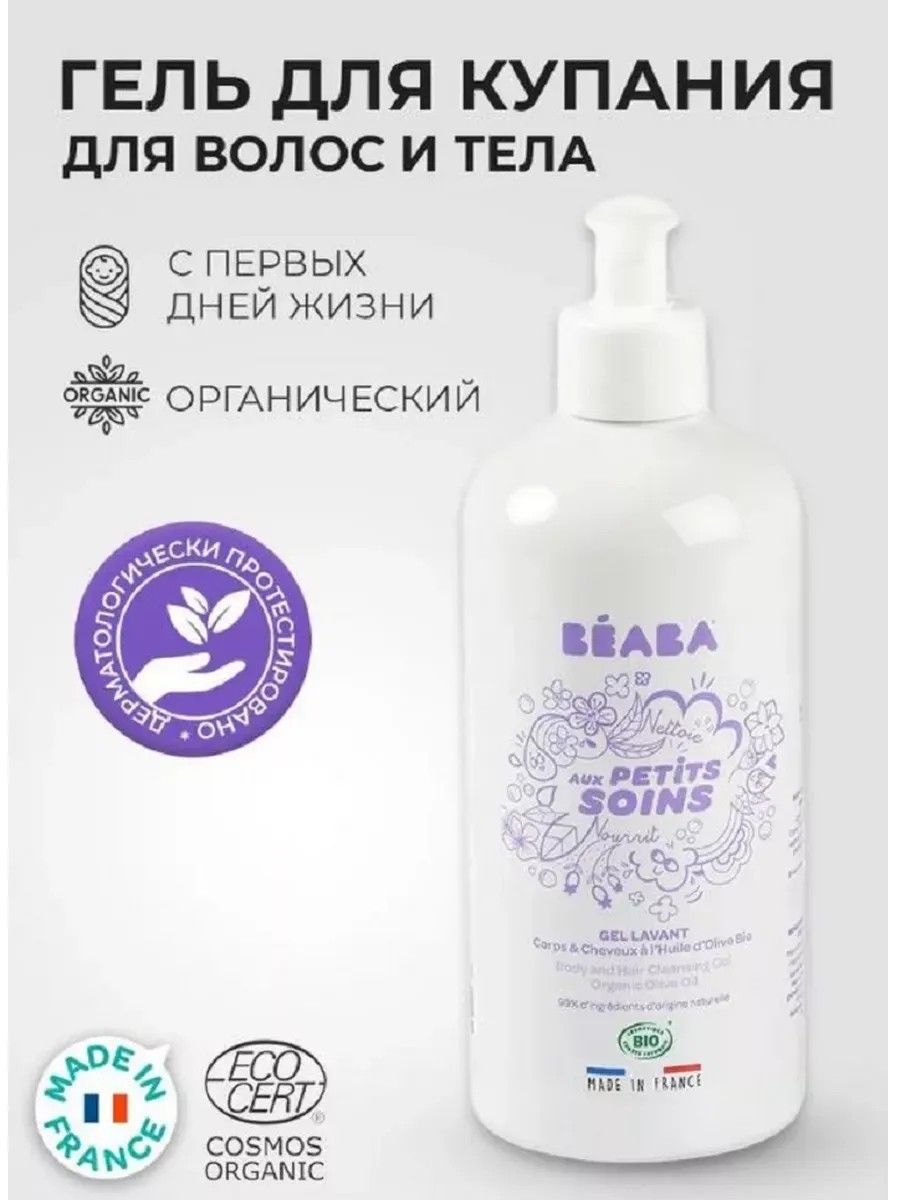 Важно отметить, что органический гель дерматологически протестирован, и содержит органическое масло алоэ вера, которое увлажняет кожу, и органическое масло сладкого миндаля, которое успокаивает ее. Косметика BEABA имеет сертификаты Cosmos Organic и ECOSERT, и содержит от 99% до 100% ингредиентов натурального происхождения, что подтверждено рейтингом от Yuka. Способ применения: нанесите гель на влажную кожу и волосы, вспеньте и тщательно смойте чистой водой. Гель можно использовать ежедневно. Если гель попадет в глаза, рекомендуется промыть их чистой водой.