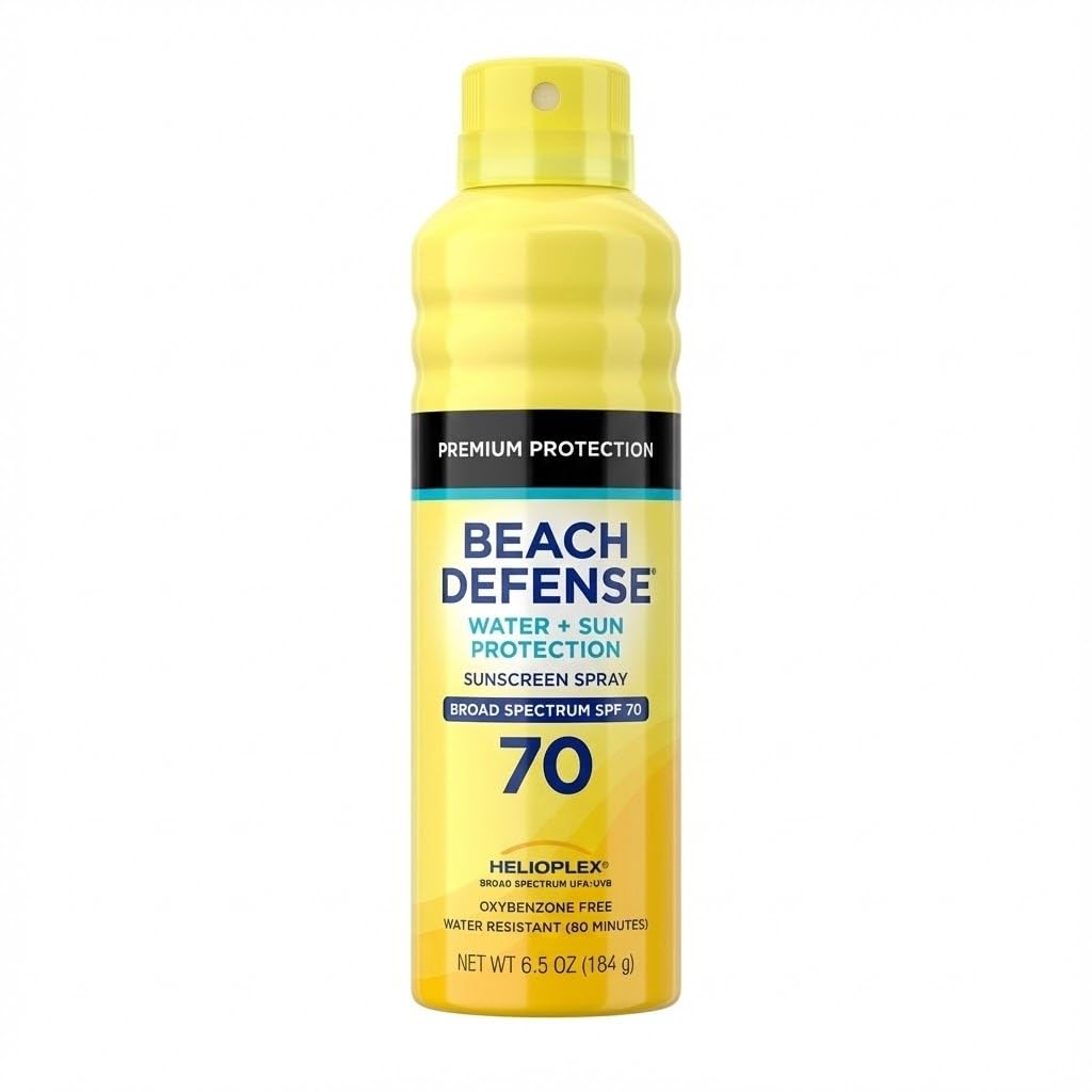 Beach Defense Water and Sun Protection Sunscreen Spray Broad Spectrum SPF 70 Oxybenzone Free Water Resistant 6.5 oz