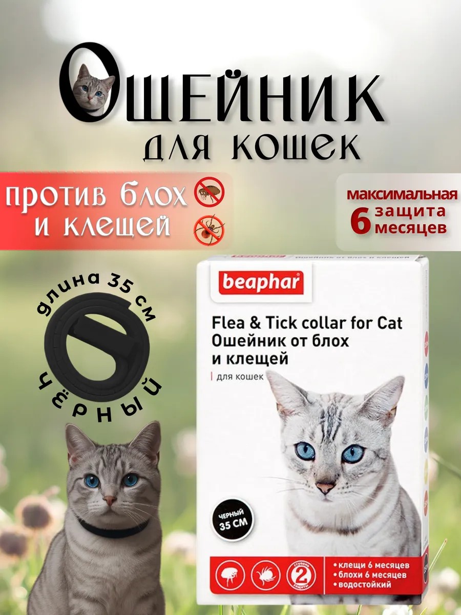 Ошейник Беафар для кошек против блох и клещей, уничтожает паразитов и защищает от повторного заражения блохами в течение 5 месяцев и клещами в течение 2 месяцев.