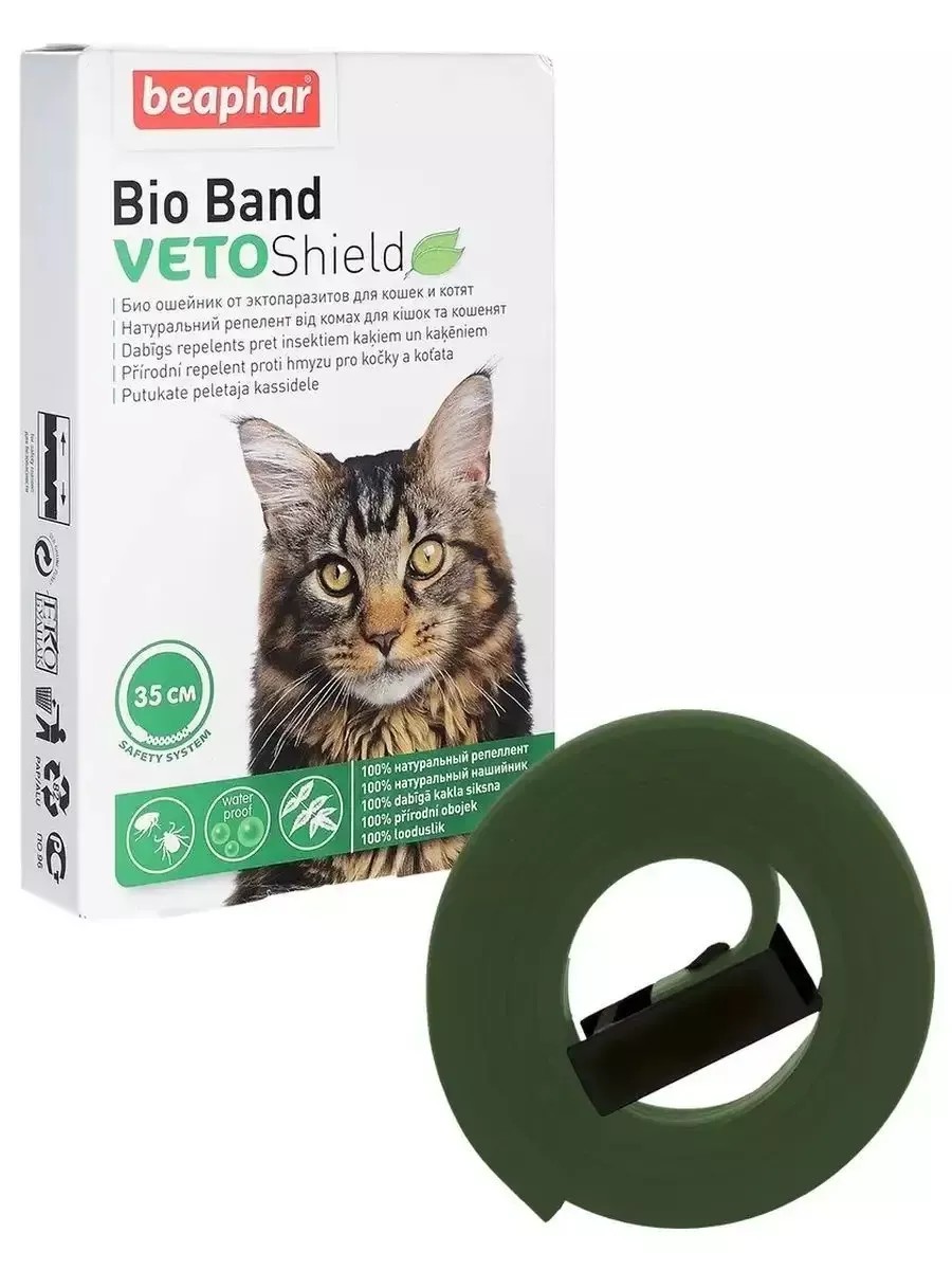 A collar with natural oils for cats and kittens 2 months and older. Wearing the collar consistently provides protection against fleas, ticks, mosquitoes, and other insects for 4 months. The collar is a multi-layered green PVC band impregnated with a blend of natural ingredients, with a lock and notches that facilitate instant unfastening and quick release of the animal. Natural plant components in the collar gradually release from the surface of the band, spreading onto the animal's coat, repel ectoparasites, and impart a pleasant scent. When used as directed, the collar is non-irritating, non-sensitizing, and non-sensitizing. Collar length: 35 cm. Ingredients: margosa extract 2%, lavender oil 1.5%, citronella oil, pennyroyal oil, eucalyptus oil, cedar (wood) oil, rue oil.