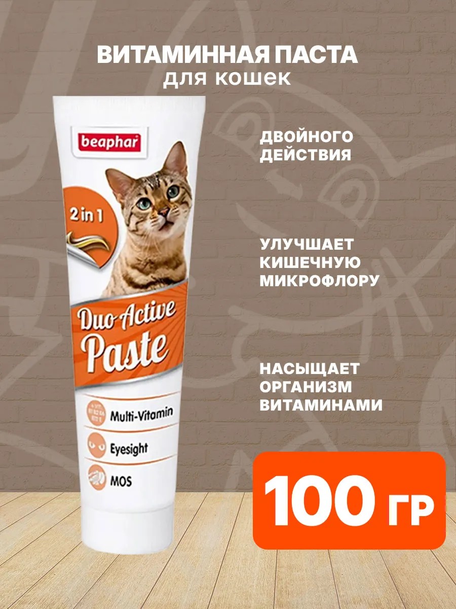 Duo Active Paste, a two-color, multivitamin, health-improving paste for cats, provides essential vitamins and improves intestinal flora. It is especially recommended after deworming, antibiotic treatments, and during the recovery period. The multivitamin (yellow) paste contains all the vitamins and minerals your cat needs to maintain its health and well-groomed appearance. Taurine supports heart function and improves vision, while omega-6 fatty acids promote healthy skin and coat, promote blood production, and enhance resistance to disease. The conditioning (brown) paste contains additional minerals and BIO-MOS (mannanoligosaccharides). BIO-MOS absorbs toxins from the body and actively stimulates the formation of healthy intestinal flora in cats. Ingredients: Fats, milk and dairy products, derivatives of vegetable origin (malt extract - 3.8%, mannan-oligosaccharides (MOS) - 4700 mg/kg), inactivated yeast, minerals, cereals. Guaranteed analysis: Protein - 16% Fats - 53% Omega-3 - 3.129% Omega-6 - 24.15% Fiber - 0.05% Ash - 4.2% Moisture - 2.1% Calcium - 0.54% Phosphorus - 0.45% Sodium - 0.4% Potassium - 0.68% Magnesium - 0.046%. Additives per 1 kg: Vitamin B1 - 370 mg, Vitamin B2 - 110 mg, Pantothenic acid - 110 mg, Nicotinamide - 1000 mg, Vitamin B6 - 110 mg, Vitamin B12 - 780 mcg, Folate - 22 mg, Biotin - 2700 mcg, Vitamin E - 160 IU, Taurine - 4400 mg, Antioxidants. Does not contain GMOs. Dosage: Apply 3 cm of paste daily. Double the dosage in severe cases. Directions for use: Mix with food or give directly from the tube. Provide the animal with plenty of fresh drinking water.