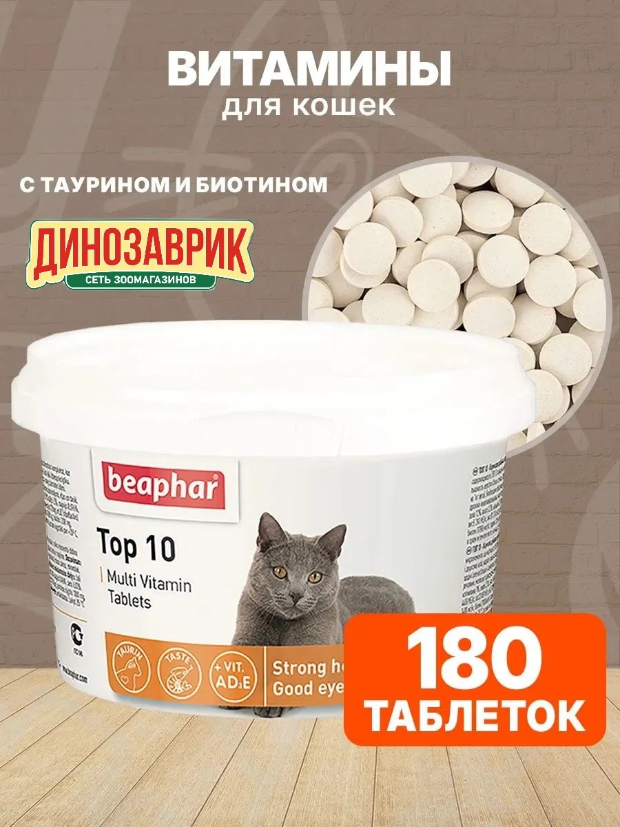 Beaphar Top 10 Vitamins for Cats with Taurine and L-Carnitine, 180 Tablets. Top 10 Tablets are an excellent multivitamin supplement with biotin and taurine for cats. The tablets contain the daily requirement of all essential vitamins, minerals, and trace elements that support your cat's vitality and physical condition. Taurine improves vision, and biotin improves skin and coat condition.
