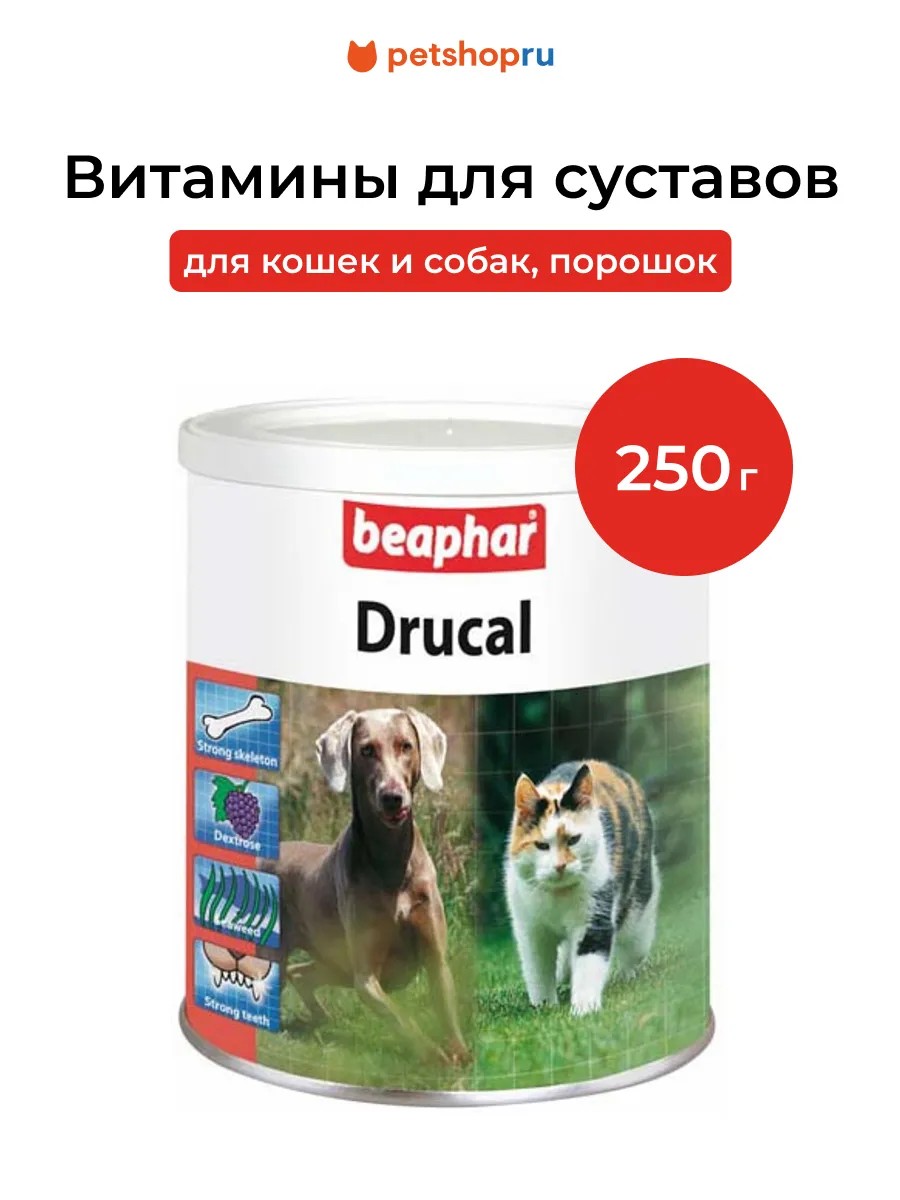 Beaphar Dru Cal подходит собакам, кошкам и грызунам.Dru cal представляет собой смесь высококачественных минералов, обогащенных виноградным сахаром, здоровыми растительными ингредиентами и богатыми витаминами водорослями.Боли в суставах, слабый костяк и слабая мускулатура часто являются следствием несбалансированного питания вашего животного. Dru cal содержатся необходимые для сильных мускулов, прочных суставов и сильных зубов кальций и минералы.Способ употребления По необходимости увлажните корм для животного, добавьте дозу Друкала, соответствующую весу животного и перемешайте.Дозировка ⸙ Для собак мелких пород, кошек и пушных животных: 1 мерная ложка в день. ⸙ Для собак средних пород: 2 мерных ложки в день. ⸙ Для крупных собак: 3 мерных ложки в день.Удвойте эту дозировку для: животных, страдающих слабостью мускулатуры, кишечными расстройствами или беременных и/или кормящих животных. 1 мерная ложка содержит 3 г Друкала