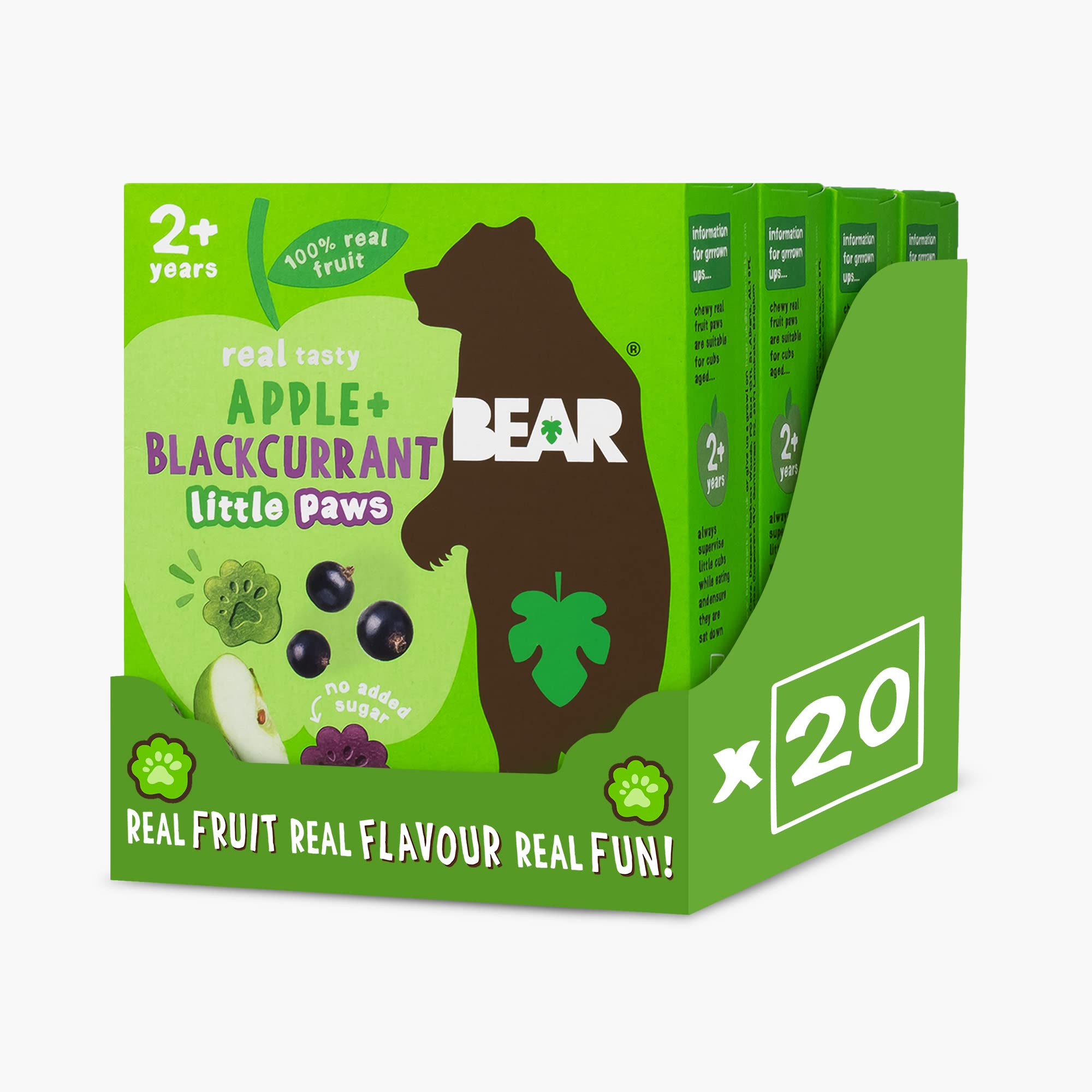 BEAR Paws are made from 100 pure, seasonally picked fruit, gently cooked into fun, no-nonsense footprint shapes. They contain absolutely no added sugar, sulfites, or stabilizers and are never made from concentrate. Packed with fiber, they also count as one of your five a day. Perfect for little paws. INGREDIENTS Apple Paws: Apples (50 ), Pears (50 ). Blackcurrant Paws: Apples (46.7 ), Pears (46.7 ), Blackcurrants (6.6 ). INSTRUCTIONS Open the package and serve. Suitable for children 2 years and older. See more