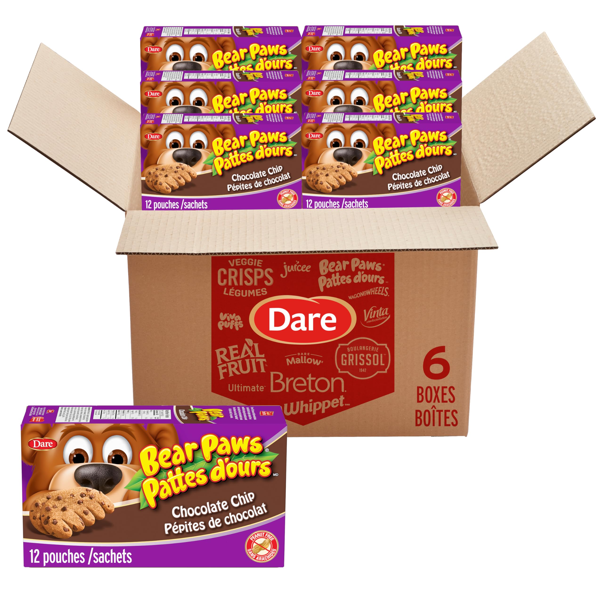 Kids love Bear Paws Chocolate Chip cookies, and parents do too! That’s because each soft cookie is made better with real chocolate chips and no artificial colours, flavours or sweeteners. These delicious cookies are wrapped two per pouch, so they stay moist and chewy. You can pack them in the lunch box for an easy snack, enjoy them at home or on the go. Bear Paws Chocolate Chip cookies are peanut-free. Pack of 6 boxes of 12 pouches in each box, 72 pouches total.