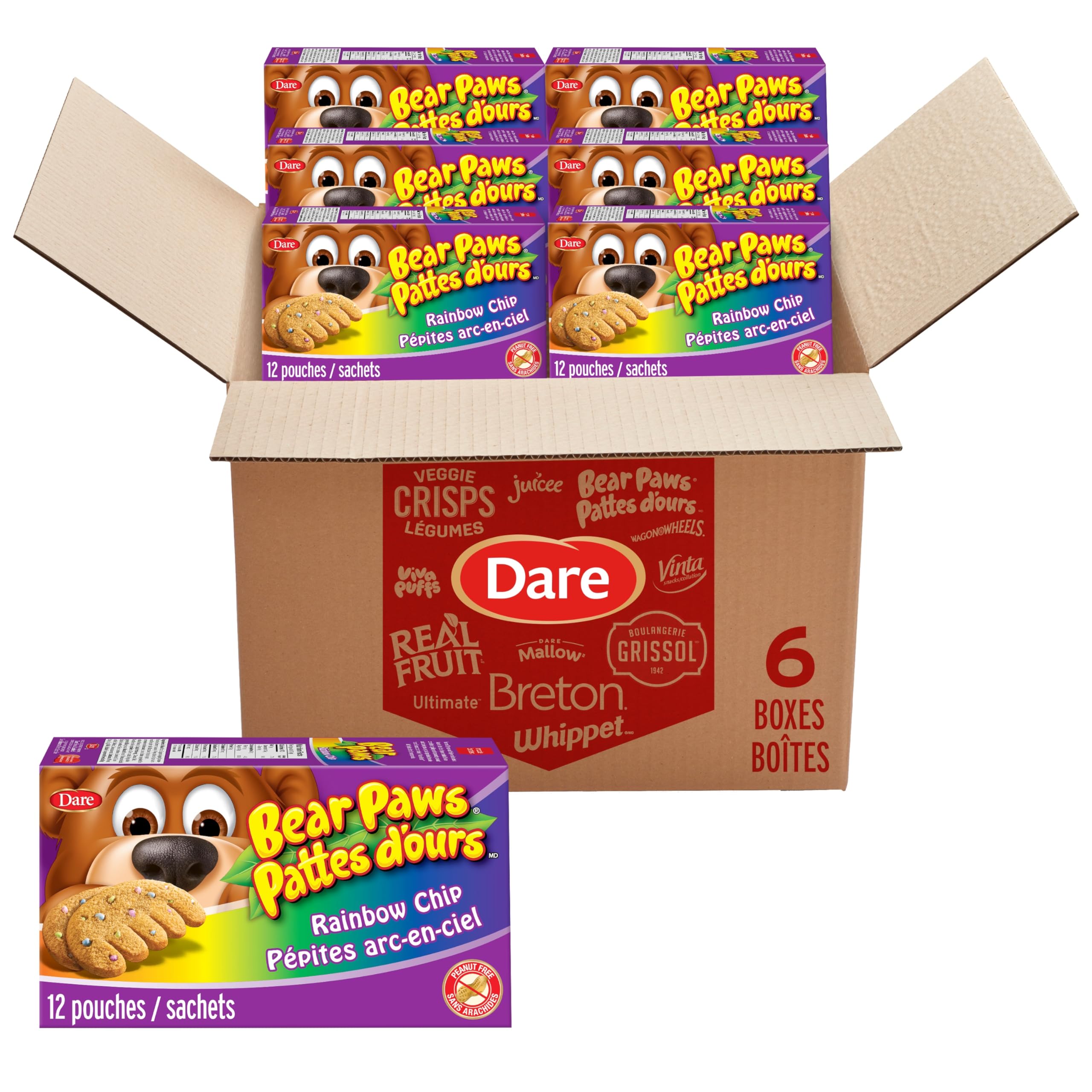 Kids love Bear Paws Rainbow Chip cookies, and parents do too! That’s because each soft cookie is made better with real chocolate chips and no artificial colours, flavours or sweeteners. These delicious cookies are wrapped two per pouch, so they stay moist and chewy. You can pack them in the lunch box for an easy snack, enjoy them at home or on the go. Bear Paws Rainbow Chip cookies are peanut-free. Pack of 6 boxes of 12 pouches in each box, 72 pouches total.