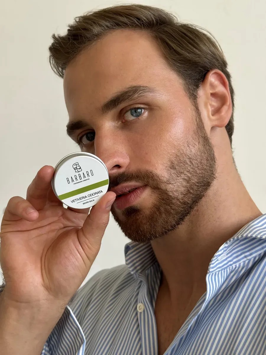 Barbaro Softening Beard Balm contains only natural oils and beeswax. Its formula not only moisturizes and makes your beard more manageable, but also relieves skin irritation, restores the hair follicle, promotes hair growth and restoration, heals wounds, and soothes itching and burning. The balm perfectly manages unruly beards, giving them the desired shape. This product is free of silicones and parabens, giving your beard a well-groomed and attractive appearance. The VETIVERIA ODORATA fragrance is a rich, woody aroma with notes of vetiver, ginger, and bergamot. A rugged and distinguished man, masculine, and loving the attention of women. Apply the balm with light hand movements, massaging and rubbing in. For a medium-length beard, one pea-sized amount of balm is sufficient. Our beard care products are just what the man needs. They provide optimal care for your beard and mustache, helping to maintain their health and attractiveness. Our beard care product nourishes your facial skin, preventing itching and flaking. Our men's beard and mustache wax will help you create the perfect style and style your hair. It perfectly holds your mustache and beard in place, adding shape and shine.