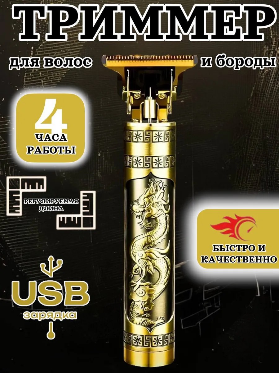 Внимание цвет товара может немного отличаться.Портативный триммер как в баршопе - беспроводной универсальный девайс для стрижки волос, бороды и усов. Качественная электрическая машинка позволит хорошо экономить на парикмахерской и стилисте, на покупке различных кремов для бритья и сменных головок для бритвенного станка, на бритве металлической и кассет для бритья. Шейвер предназначен для ежедневного чистого сухого бритья щетины, использования дома и в дорожных условиях. Подровнять контуры бороды поможет безопасная бритва. Машинка для бритья мужская не вызывает раздражения кожи, легко обслуживается. В комплекте идет электротриммер, смазочное масло и маленькая щеточка для ухода за инструментом, 4 сменные насадки 1.5, 2, 3, 4 мм. Приятный дизайн и эргономичная ручка электробритвы позволяют удобно держать ее в руке. Беспроводной триммер для мужчин без труда составит конкуренцию профессиональной парикхмахерской стрижке и сократит походы к барберу. Портативная машинка имеет острый подстригательный элемент, она отлично подойдет для влажного и сухого бритья. Дорожный вариант удобно брать с собой в баню и поездки, так как она компактная и легко поместится в рюкзаке. Металлический корпус в золотом оформлении и выгравированный дракон - отличный подарочный комплект для друга, брата или коллеги. Мощный и многофункциональный, подходит для окантовки и оформления контуринга щетины, бритвенное изделие относительно бесшумное и имеет водонепроницаемый корпус.