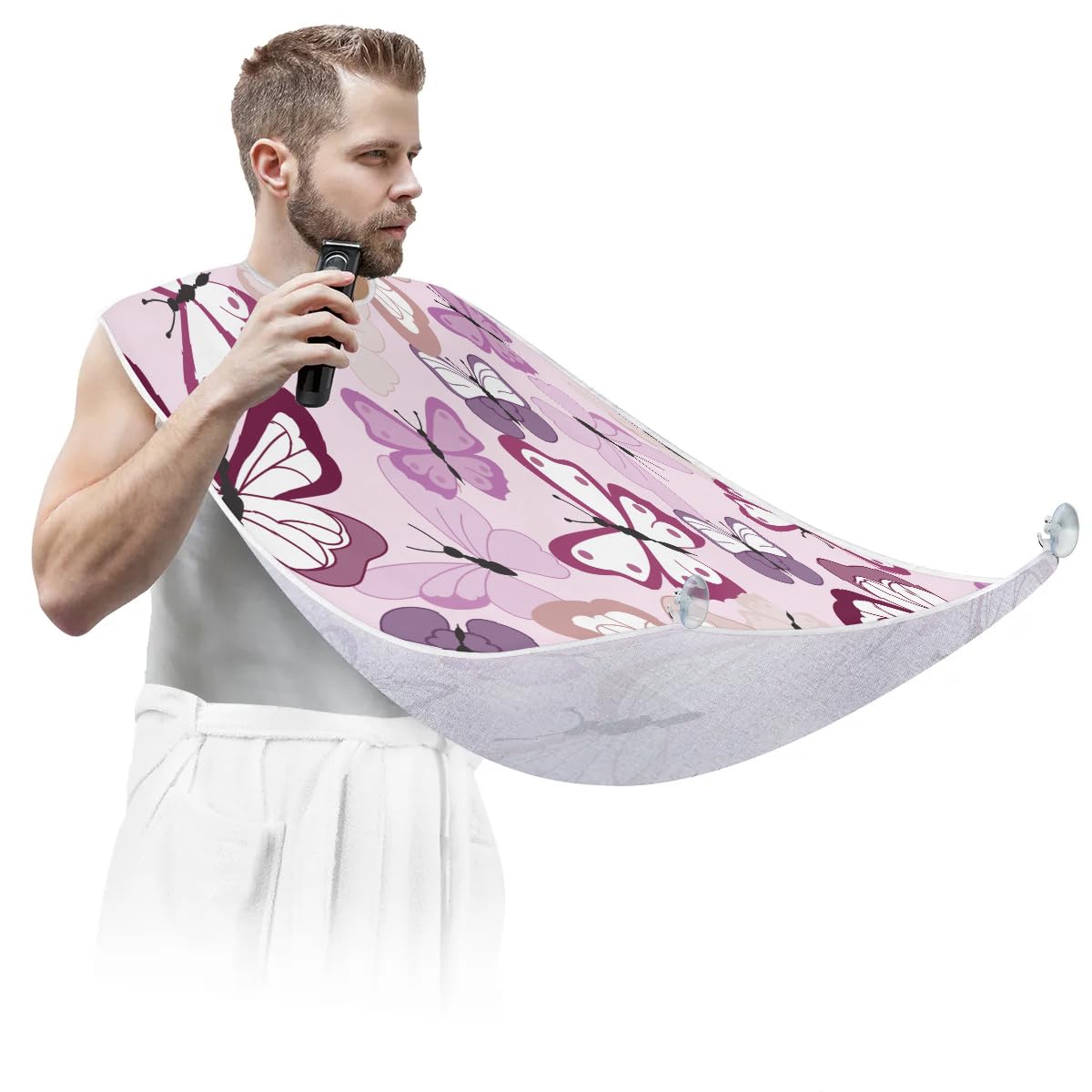 fiber fabric, ensuring exceptional quality. The fabric has a smooth and soft surface that is not sticky to hair, making it comfortable to wear during grooming sessions. It is also waterproof and anti-static, further enhancing its practicality. In addition, it is equipped with two high-quality suction hooks that provide powerful suction without leaving marks on mirrors or tiles. ?Convenient and Easy to Use?: Using our beard hair catcher is a breeze. Just fasten it around your neck using the adjustable strap and secure it to the mirror. Once in place, you can effortlessly proceed with your regular grooming routine. When you're done, simply remove the beard bib from the suction cups. Then brush the collected hair into the trash can for easy cleanup. ?Effortless Hair Cleanup?: Our Butterfly Painting beard bib is expertly designed to capture all loose beard hair, mustache, and sideburn trimmings, providing effortless cleanup and keeping your sink immaculately clean. This saves you valuable time that would otherwise be spent on tedious cleaning tasks. Not only does it serve a practical function, but it also adds a stylish touch to your daily grooming routine.