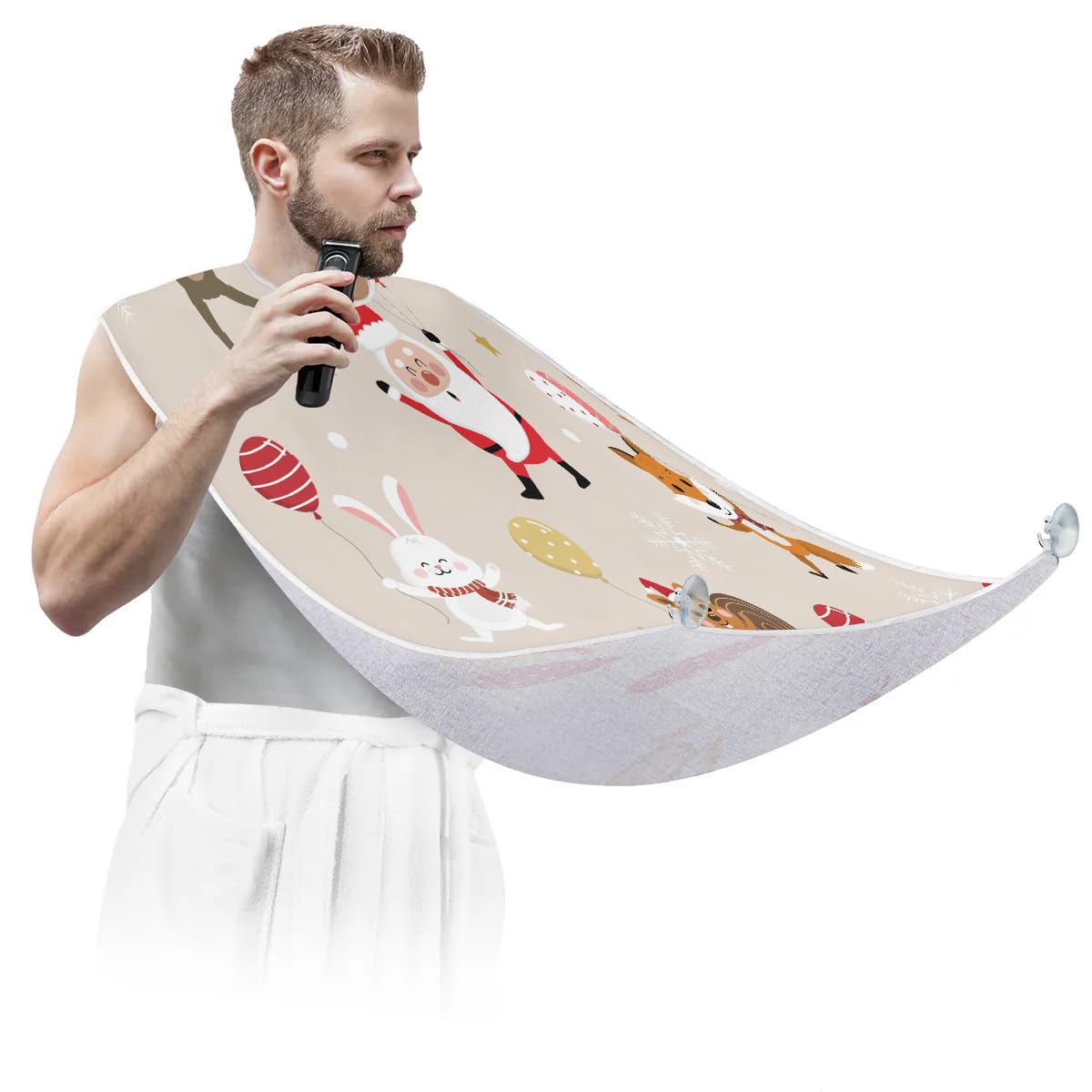 fiber fabric, ensuring exceptional quality. The fabric has a smooth and soft surface that is not sticky to hair, making it comfortable to wear during grooming sessions. It is also waterproof and anti-static, further enhancing its practicality. In addition, it is equipped with two high-quality suction hooks that provide powerful suction without leaving marks on mirrors or tiles. ?Convenient and Easy to Use?: Using our beard hair catcher is a breeze. Just fasten it around your neck using the adjustable strap and secure it to the mirror. Once in place, you can effortlessly proceed with your regular grooming routine. When you're done, simply remove the beard bib from the suction cups. Then brush the collected hair into the trash can for easy cleanup. ?Effortless Hair Cleanup?: Our Christmas Santa Animal Balloon beard bib is expertly designed to capture all loose beard hair, mustache, and sideburn trimmings, providing effortless cleanup and keeping your sink immaculately clean. This saves you valuable time that would otherwise be spent on tedious cleaning tasks. Not only does it serve a practical function, but it also adds a stylish touch to your daily grooming routine.