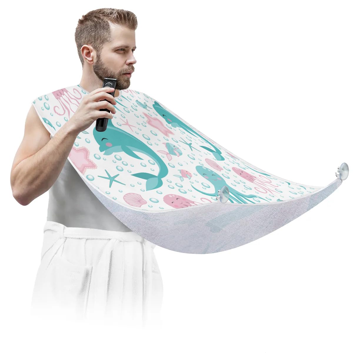 fiber fabric, ensuring exceptional quality. The fabric has a smooth and soft surface that is not sticky to hair, making it comfortable to wear during grooming sessions. It is also waterproof and anti-static, further enhancing its practicality. In addition, it is equipped with two high-quality suction hooks that provide powerful suction without leaving marks on mirrors or tiles. ?Convenient and Easy to Use?: Using our beard hair catcher is a breeze. Just fasten it around your neck using the adjustable strap and secure it to the mirror. Once in place, you can effortlessly proceed with your regular grooming routine. When you're done, simply remove the beard bib from the suction cups. Then brush the collected hair into the trash can for easy cleanup. ?Effortless Hair Cleanup?: Our Dolphin Jellyfish Starfish beard bib is expertly designed to capture all loose beard hair, mustache, and sideburn trimmings, providing effortless cleanup and keeping your sink immaculately clean. This saves you valuable time that would otherwise be spent on tedious cleaning tasks. Not only does it serve a practical function, but it also adds a stylish touch to your daily grooming routine.