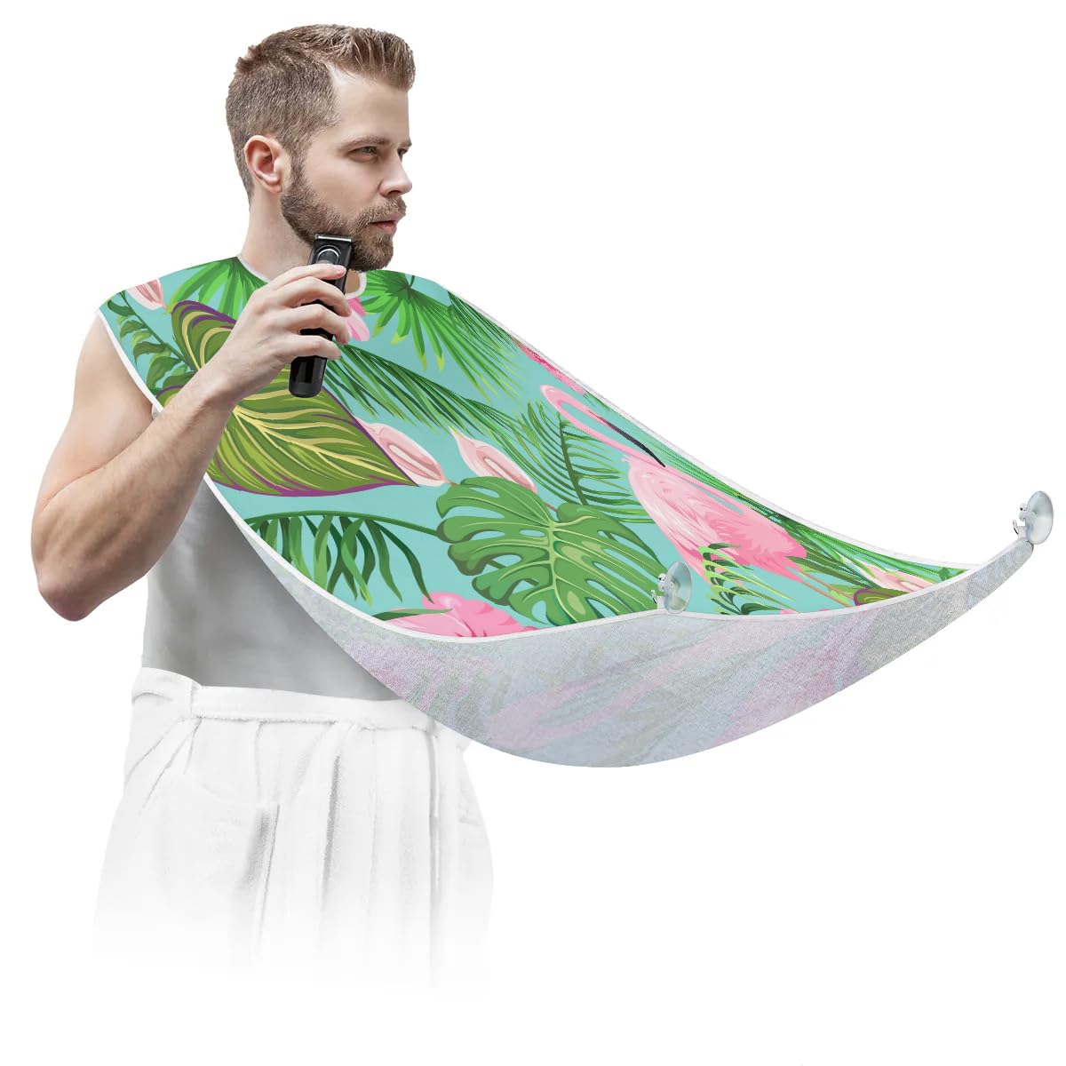 fiber fabric, ensuring exceptional quality. The fabric has a smooth and soft surface that is not sticky to hair, making it comfortable to wear during grooming sessions. It is also waterproof and anti-static, further enhancing its practicality. In addition, it is equipped with two high-quality suction hooks that provide powerful suction without leaving marks on mirrors or tiles. ?Convenient and Easy to Use?: Using our beard hair catcher is a breeze. Just fasten it around your neck using the adjustable strap and secure it to the mirror. Once in place, you can effortlessly proceed with your regular grooming routine. When you're done, simply remove the beard bib from the suction cups. Then brush the collected hair into the trash can for easy cleanup. ?Effortless Hair Cleanup?: Our Flamingo Flowers Leaf beard bib is expertly designed to capture all loose beard hair, mustache, and sideburn trimmings, providing effortless cleanup and keeping your sink immaculately clean. This saves you valuable time that would otherwise be spent on tedious cleaning tasks. Not only does it serve a practical function, but it also adds a stylish touch to your daily grooming routine.