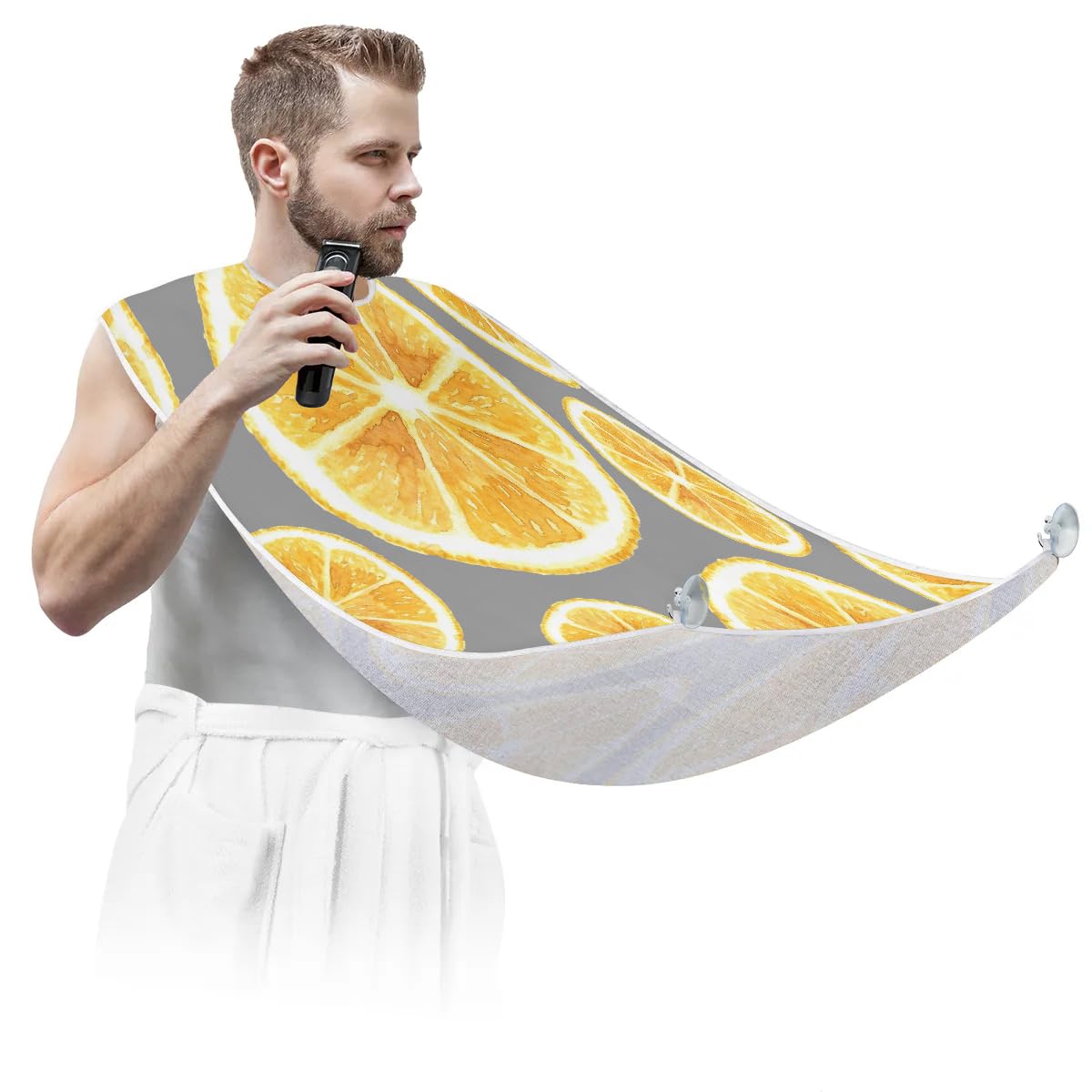 fiber fabric, ensuring exceptional quality. The fabric has a smooth and soft surface that is not sticky to hair, making it comfortable to wear during grooming sessions. It is also waterproof and anti-static, further enhancing its practicality. In addition, it is equipped with two high-quality suction hooks that provide powerful suction without leaving marks on mirrors or tiles. ?Convenient and Easy to Use?: Using our beard hair catcher is a breeze. Just fasten it around your neck using the adjustable strap and secure it to the mirror. Once in place, you can effortlessly proceed with your regular grooming routine. When you're done, simply remove the beard bib from the suction cups. Then brush the collected hair into the trash can for easy cleanup. ?Effortless Hair Cleanup?: Our Fruits Lemons Paint beard bib is expertly designed to capture all loose beard hair, mustache, and sideburn trimmings, providing effortless cleanup and keeping your sink immaculately clean. This saves you valuable time that would otherwise be spent on tedious cleaning tasks. Not only does it serve a practical function, but it also adds a stylish touch to your daily grooming routine.