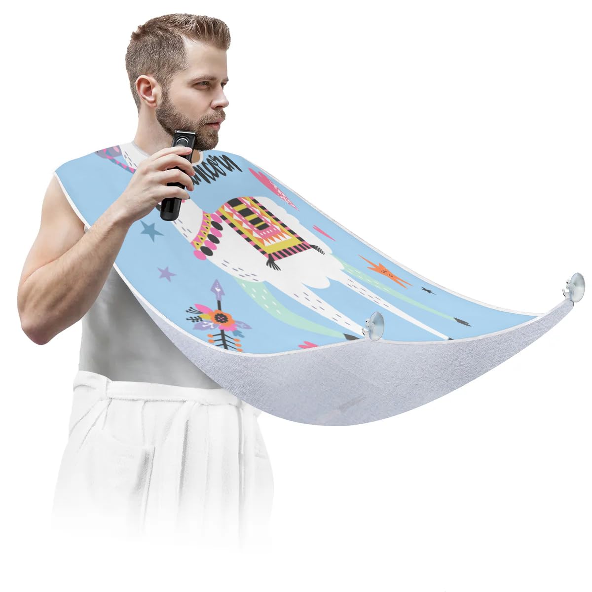 fiber fabric, ensuring exceptional quality. The fabric has a smooth and soft surface that is not sticky to hair, making it comfortable to wear during grooming sessions. It is also waterproof and anti-static, further enhancing its practicality. In addition, it is equipped with two high-quality suction hooks that provide powerful suction without leaving marks on mirrors or tiles. ?Convenient and Easy to Use?: Using our beard hair catcher is a breeze. Just fasten it around your neck using the adjustable strap and secure it to the mirror. Once in place, you can effortlessly proceed with your regular grooming routine. When you're done, simply remove the beard bib from the suction cups. Then brush the collected hair into the trash can for easy cleanup. ?Effortless Hair Cleanup?: Our Funny Alpaca Painting beard bib is expertly designed to capture all loose beard hair, mustache, and sideburn trimmings, providing effortless cleanup and keeping your sink immaculately clean. This saves you valuable time that would otherwise be spent on tedious cleaning tasks. Not only does it serve a practical function, but it also adds a stylish touch to your daily grooming routine.