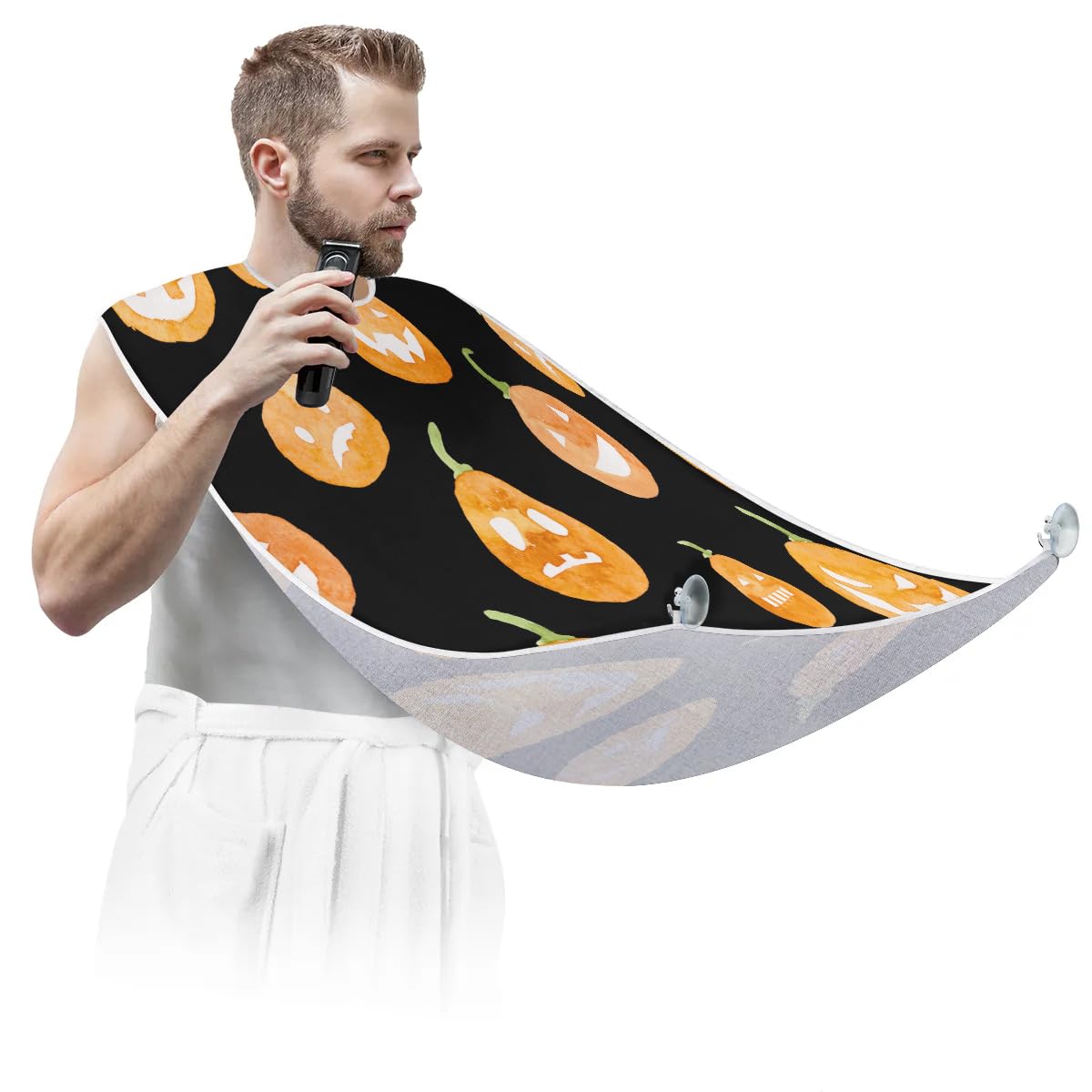fiber fabric, ensuring exceptional quality. The fabric has a smooth and soft surface that is not sticky to hair, making it comfortable to wear during grooming sessions. It is also waterproof and anti-static, further enhancing its practicality. In addition, it is equipped with two high-quality suction hooks that provide powerful suction without leaving marks on mirrors or tiles. ?Convenient and Easy to Use?: Using our beard hair catcher is a breeze. Just fasten it around your neck using the adjustable strap and secure it to the mirror. Once in place, you can effortlessly proceed with your regular grooming routine. When you're done, simply remove the beard bib from the suction cups. Then brush the collected hair into the trash can for easy cleanup. ?Effortless Hair Cleanup?: Our Halloween Pumpkin Painting beard bib is expertly designed to capture all loose beard hair, mustache, and sideburn trimmings, providing effortless cleanup and keeping your sink immaculately clean. This saves you valuable time that would otherwise be spent on tedious cleaning tasks. Not only does it serve a practical function, but it also adds a stylish touch to your daily grooming routine.