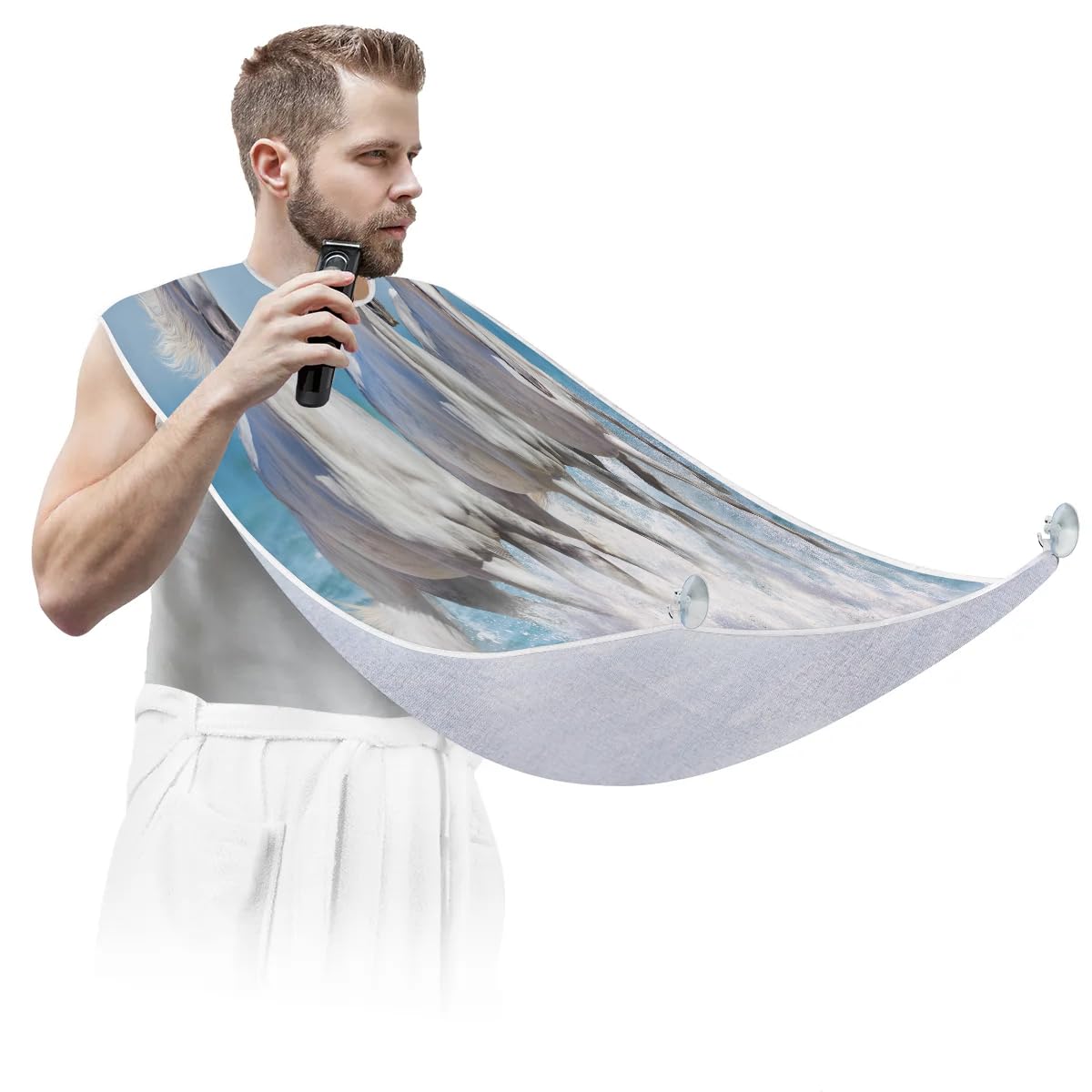 fiber fabric, ensuring exceptional quality. The fabric has a smooth and soft surface that is not sticky to hair, making it comfortable to wear during grooming sessions. It is also waterproof and anti-static, further enhancing its practicality. In addition, it is equipped with two high-quality suction hooks that provide powerful suction without leaving marks on mirrors or tiles. ?Convenient and Easy to Use?: Using our beard hair catcher is a breeze. Just fasten it around your neck using the adjustable strap and secure it to the mirror. Once in place, you can effortlessly proceed with your regular grooming routine. When you're done, simply remove the beard bib from the suction cups. Then brush the collected hair into the trash can for easy cleanup. ?Effortless Hair Cleanup?: Our Horses beard bib is expertly designed to capture all loose beard hair, mustache, and sideburn trimmings, providing effortless cleanup and keeping your sink immaculately clean. This saves you valuable time that would otherwise be spent on tedious cleaning tasks. Not only does it serve a practical function, but it also adds a stylish touch to your daily grooming routine.