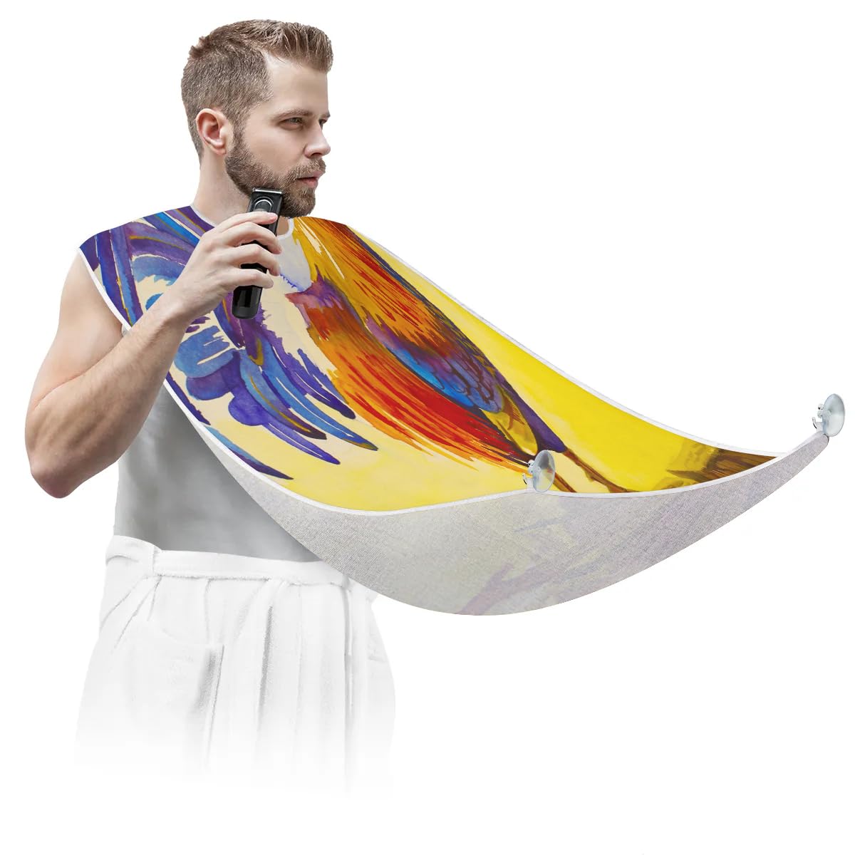 fiber fabric, ensuring exceptional quality. The fabric has a smooth and soft surface that is not sticky to hair, making it comfortable to wear during grooming sessions. It is also waterproof and anti-static, further enhancing its practicality. In addition, it is equipped with two high-quality suction hooks that provide powerful suction without leaving marks on mirrors or tiles. ?Convenient and Easy to Use?: Using our beard hair catcher is a breeze. Just fasten it around your neck using the adjustable strap and secure it to the mirror. Once in place, you can effortlessly proceed with your regular grooming routine. When you're done, simply remove the beard bib from the suction cups. Then brush the collected hair into the trash can for easy cleanup. ?Effortless Hair Cleanup?: Our Rooster Paint beard bib is expertly designed to capture all loose beard hair, mustache, and sideburn trimmings, providing effortless cleanup and keeping your sink immaculately clean. This saves you valuable time that would otherwise be spent on tedious cleaning tasks. Not only does it serve a practical function, but it also adds a stylish touch to your daily grooming routine.