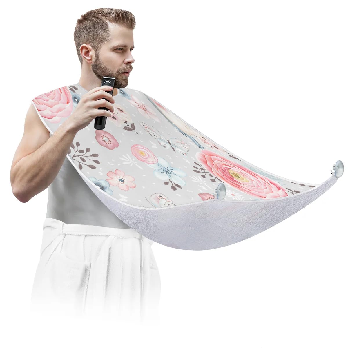 fiber fabric, ensuring exceptional quality. The fabric has a smooth and soft surface that is not sticky to hair, making it comfortable to wear during grooming sessions. It is also waterproof and anti-static, further enhancing its practicality. In addition, it is equipped with two high-quality suction hooks that provide powerful suction without leaving marks on mirrors or tiles. ?Convenient and Easy to Use?: Using our beard hair catcher is a breeze. Just fasten it around your neck using the adjustable strap and secure it to the mirror. Once in place, you can effortlessly proceed with your regular grooming routine. When you're done, simply remove the beard bib from the suction cups. Then brush the collected hair into the trash can for easy cleanup. ?Effortless Hair Cleanup?: Our Rose Butterfly beard bib is expertly designed to capture all loose beard hair, mustache, and sideburn trimmings, providing effortless cleanup and keeping your sink immaculately clean. This saves you valuable time that would otherwise be spent on tedious cleaning tasks. Not only does it serve a practical function, but it also adds a stylish touch to your daily grooming routine.