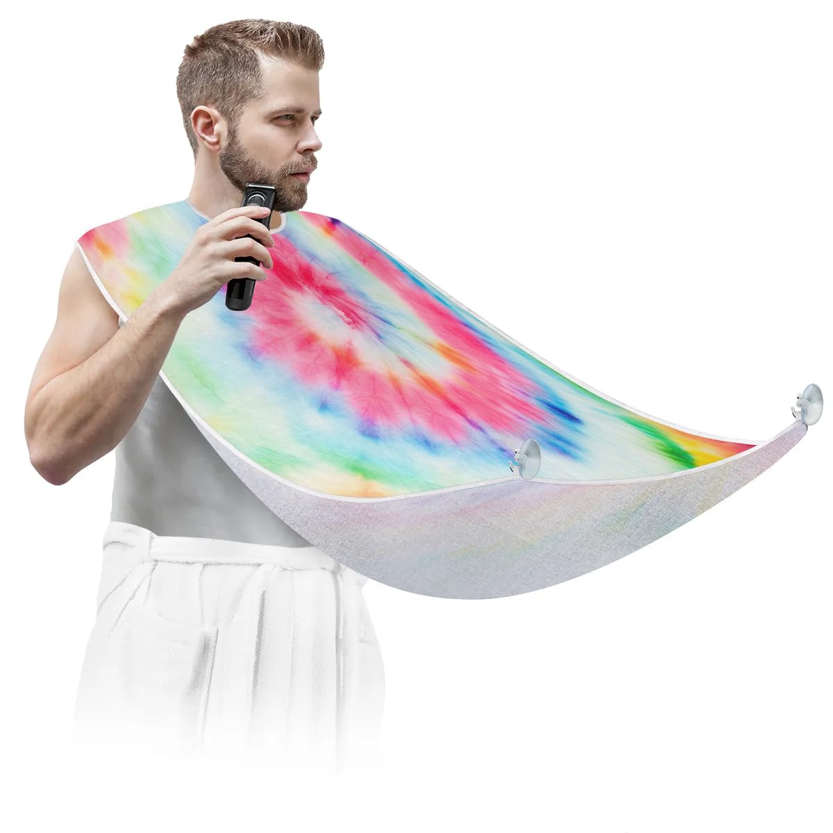 fiber fabric, ensuring exceptional quality. The fabric has a smooth and soft surface that is not sticky to hair, making it comfortable to wear during grooming sessions. It is also waterproof and anti-static, further enhancing its practicality. In addition, it is equipped with two high-quality suction hooks that provide powerful suction without leaving marks on mirrors or tiles. ?Convenient and Easy to Use?: Using our beard hair catcher is a breeze. Just fasten it around your neck using the adjustable strap and secure it to the mirror. Once in place, you can effortlessly proceed with your regular grooming routine. When you're done, simply remove the beard bib from the suction cups. Then brush the collected hair into the trash can for easy cleanup. ?Effortless Hair Cleanup?: Our Tie Dye beard bib is expertly designed to capture all loose beard hair, mustache, and sideburn trimmings, providing effortless cleanup and keeping your sink immaculately clean. This saves you valuable time that would otherwise be spent on tedious cleaning tasks. Not only does it serve a practical function, but it also adds a stylish touch to your daily grooming routine.