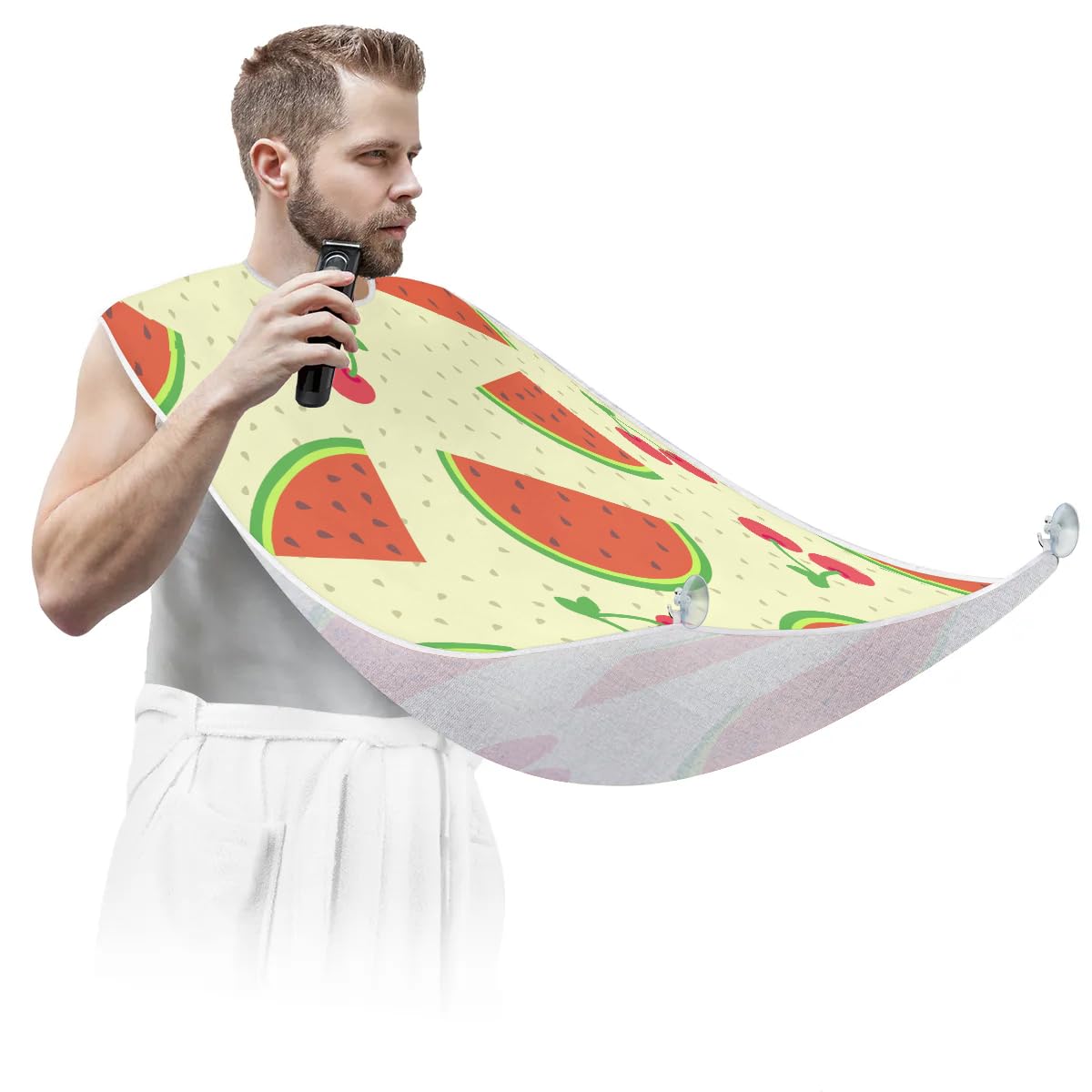 fiber fabric, ensuring exceptional quality. The fabric has a smooth and soft surface that is not sticky to hair, making it comfortable to wear during grooming sessions. It is also waterproof and anti-static, further enhancing its practicality. In addition, it is equipped with two high-quality suction hooks that provide powerful suction without leaving marks on mirrors or tiles. ?Convenient and Easy to Use?: Using our beard hair catcher is a breeze. Just fasten it around your neck using the adjustable strap and secure it to the mirror. Once in place, you can effortlessly proceed with your regular grooming routine. When you're done, simply remove the beard bib from the suction cups. Then brush the collected hair into the trash can for easy cleanup. ?Effortless Hair Cleanup?: Our Watermelon Cherry beard bib is expertly designed to capture all loose beard hair, mustache, and sideburn trimmings, providing effortless cleanup and keeping your sink immaculately clean. This saves you valuable time that would otherwise be spent on tedious cleaning tasks. Not only does it serve a practical function, but it also adds a stylish touch to your daily grooming routine.