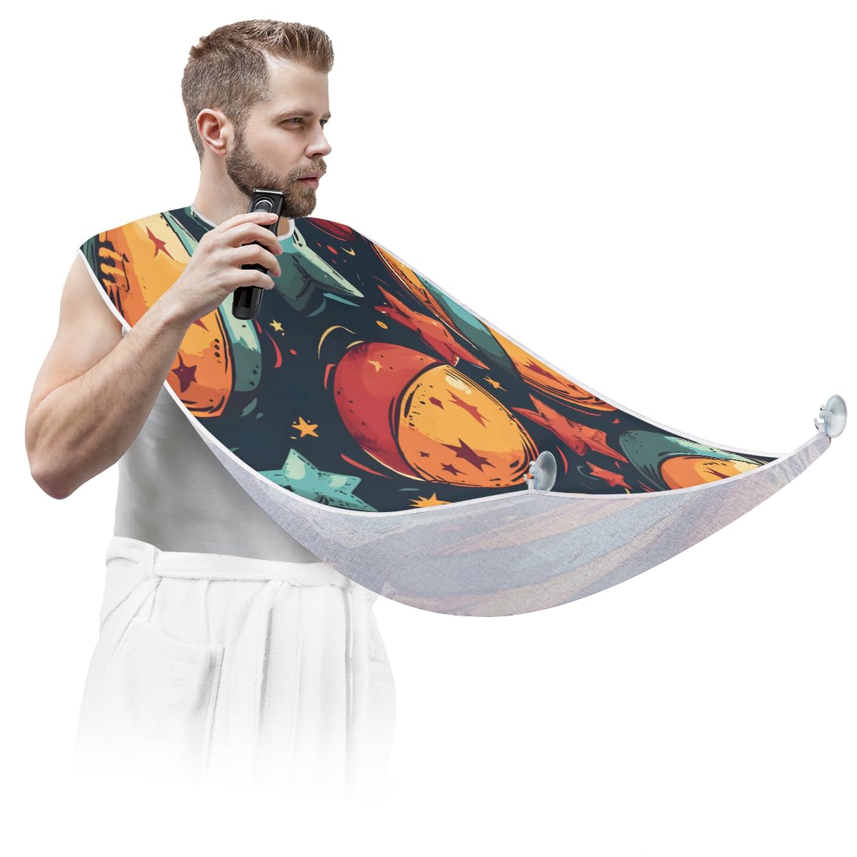 DESCRIPTION Material: polyester fabric Size: 45.2L x 28.5W inches Product includes: 1 piece shaving bib, 2 suction cup hooks. Stylish Design The stylish personalized graphic design of the beard bib makes it an avant-garde Beard Hair Catcher, with multiple graphics for you to choose from, we are sure you will fall in love with this beard catcher. Care Options Machine wash cold or hand wash, gentle cycle, air dry naturally or tumble dry low temperature, do not use bleach. Convenient to carry The collapsible function of the beard bib allows you to easily put it into your backpack or suitcase even when you are traveling, on business trips, folding it up won't take up too much space for you.