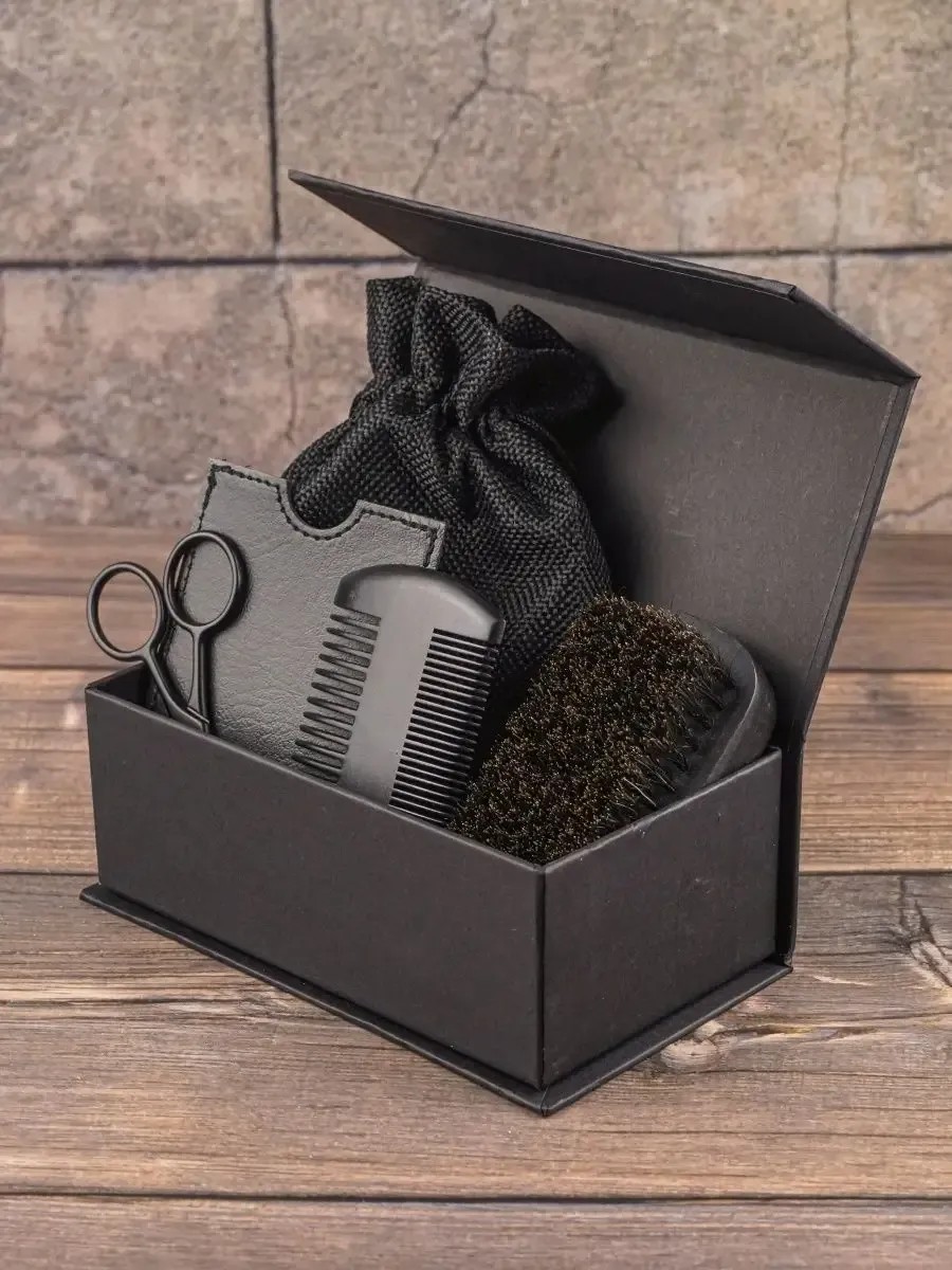 This men's beard and mustache grooming gift set helps maintain a well-groomed beard and mustache, an essential part of a modern man's daily grooming routine. The grooming set includes a beard brush, a beard and hair comb, and scissors. The beard brush is made of natural boar bristles, which gently and easily detangles hair and helps relieve itchy scalp. The natural bristle brush evenly distributes oils or waxes, and is ideal for dry massage, stimulating hair growth and improving circulation. The wooden beard comb, handcrafted from hardwood, can be used for styling your mustache, beard, and hair. 2. This stylish comb with fine, strong wooden teeth combs any hair type or beard. It comes with a faux leather case and is perfect for taking with you for quick touch-ups. This beard comb is ideal for applying masks, hair serums, and styling products. This facial brush is gentle on even sensitive and dry skin, giving hair a healthy shine and a well-groomed appearance. Natural boar bristles help distribute oils and improve the structure of coarse hair. This beard grooming kit works well with beard oils, balms, waxes, and conditioners. It's also ideal for grooming a mustache and beard. 3. Use the convenient scissors to maintain your beard and mustache at the desired length. This gift set for men is packaged in an elegant fabric pouch. This mustache and beard grooming kit makes a great gift for men for any occasion. Home Barber. IMPORTANT: Do not wet the brush body. Rinse the brush regularly, bristles down, and dry it the same way. Do not expose the brush to water for long periods of time. Store in a dry, ventilated area away from heat sources.