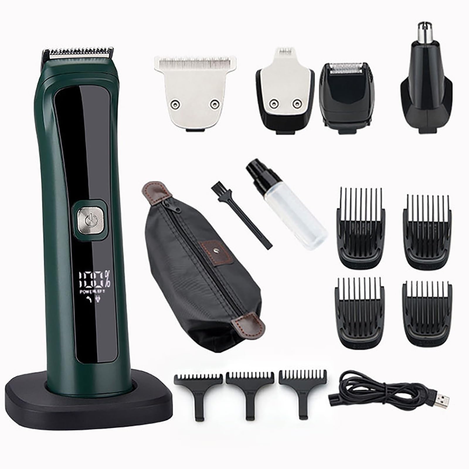 Self-Sharp BladeThe stainless steel blades are self-sharpening and have a precision gap for trimming. They are non-corrosive, preventing rust and skin irritation.High Speed MotorThe 8800 RPM speed can cut thicker hair more easily. The high-quality motor produces low noise for a pleasant grooming experience.IPX7 WashableOur kit is designed to be fully washable, making it easy to clean.The blades are also detachable and can be cleaned with the brush included in the kit.LCD Smart DisplayUp to about 90 minutes of shaving time by only about 2 hour charging. The hair trimmer is equipped with a high definition LED display.SpecificationItem Type: Beard Trimmer for MenMaterial: Stainless Steel Knife, ABSColor: Dark GreenCharging Time: 2 hoursRunning Time: 90 minutesBattery Type: Lithium-ion batteryWhat You Get 1x hair machine1x hair clipper1x T-blade liner trimmer1x nose hair trimmer1x precision trimmer1x foil shaver4x guide combs1x charging base1 x charging cable1x oil1x carry bag