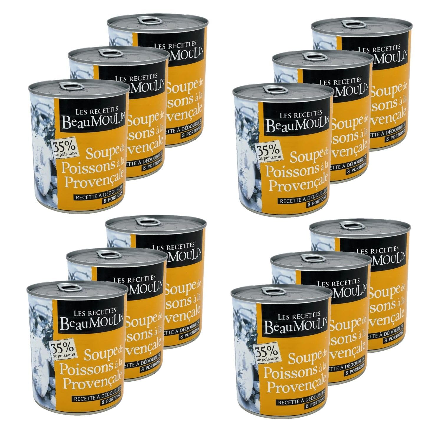 This set contains 12 products as described below: Authentic Provençal fish soup recipe, with 35 fish. Discover this recipe from BeauMoulin. 8 servings. Ingredients: Water, various fish 35 , rapeseed oil, modified corn starch, double concentrated tomato puree, dehydrated onions, salt, flavor enhancer: monosodium glutamate, herbs, spices, orange juice powder (concentrated orange juice, maltodextrin, acidity regulator: citric acid). Allergens: Fish Storage instructions: Store at room temperature, away from heat and humidity, before opening. Instructions for use: Pour the contents of this can into a container. Add water up to its volume. Heat gently while stirring. Serve very hot. Product information: Net weight: 800g Origin: France Energy: 256kJ 61kcal Fat: 3.1g of which saturates 0.3g Carbohydrates: 3.6g of which sugars 0.9g Protein: 4.7g Dietary Fiber: Not Applicable Salt: 1.3g Packaging: Metal Tin Full details are available on the product packaging. The information on this page is for guidance only. We encourage you to read the information on the product label, especially regarding food allergies. SAFETY WARNING Full details are available on the product packaging. The information on this page is for guidance only. We encourage you to read the information on the product label, especially regarding food allergies.Lot 12x Soupe de poisson à la provençale - Boîte 800gDESCRIPTION DU PRODUIT DESCRIPTION DU PRODUIT Ce lot contient 12 produits décrits ci-dessous : Véritable recette de soupe de poisson provençale, avec 35 de poissons, découvrez cette recette proposée par BeauMoulin. 8 portions. "Ingrédients : Eau, poissons divers 35 , huile de colza, amidon modifié de maïs, purée de tomates double concentrée, oignons déshydratés, sel, exhausteur de goût : glutamate monosodique, plantes aromatiques, épices, poudre de jus d'orange (jus d'orange concentré, maltodextrine, correcteur d'acidité : acide citrique). Allergènes : Poisson Mode de conservation : A conserver à température ambiante, à l'abri de la chaleur et de l'humidité avant ouverture. Conseil d'utilisation : Verser le contenu de cette boîte dans un récipient. Ajoutez jusqu'à une fois son volume d'eau. Réchauffez à feu doux tout en remuant. Servir très chaud. Informations produit : Poids net : 800g Origine : France Energie : 256KJ 61Kcal Lipides : 3,1g dont acides gras saturés 0,3g Glucides : 3,6g dont sucres 0,9g Protéines : 4,7g Fibres alimentaires : NCg Sel : 1,3g Emballage : Boîte en Métal Détail complet et disponible sur l'emballage du produit. Les informations présentes sur cette page sont à titre indicatif. Nous vous invitons à prendre connaissance des informations sur l'étiquette du produit, en particulier concernant les allergies alimentaires. AVERTISSEMENT DE SÉCURITÉ Détail complet et disponible sur l'emballage du produit. Les informations présentes sur cette page sont à titre indicatif. Nous vous invitons à prendre connaissance des informations sur l'étiquette du produit, en particulier concernant les allergies alimentaires.