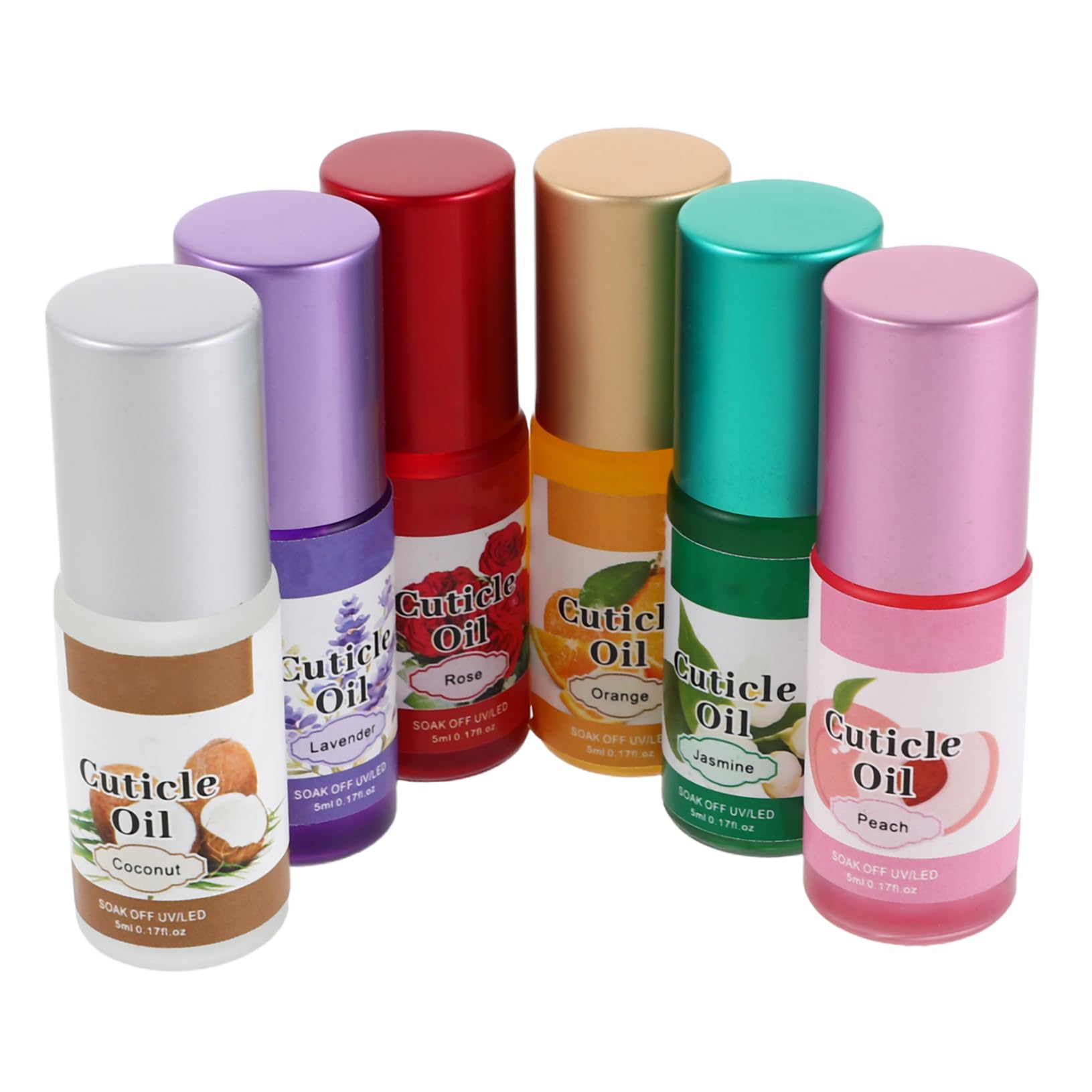 Packages of 6 x Cuticle Oil (5 ml bottle) Features - Material: Glass nail treatment - Precision roller: The ball applicator ensures the correct amount is used, delivering and applying nutrients to your nails at all times. Mini cuticle oil - Size: 6.20 x 1.80 x 1.80 cm 2.44 x 0.71 x 0.71 in - Fast absorption: The non-greasy, fast-absorbing formula immediately hydrates dryness around the nails, improving the overall appearance of the cuticle oil pen. - Natural and gentle: Contains natural and gentle ingredients suitable for all skin types, leaving a soft and delicate feel on your fingertips. Nail Oil - Product Information: Nourishing Cuticle Oil: Provides nourishment to the edges of nails, effectively treating ingrown nails and cracks, making it an essential nail care oil. - Improves Nail Strength: Regular application strengthens nails, reduces breakage, and promotes a healthy appearance and strong nails. Mini Cuticle Oil Bottles - Color: Multi-Nourishing Cuticle Oil. : Nail Treatment. The rollerball applicator glides effortlessly onto nail edges, providing a soothing and moisturizing treatment. Cuticle Repair Oil: Transform your nail care routine with this moisturizing cuticle oil. Cuticle Revitalizing Oil: Whether used after a manicure or as part of your evening routine, it helps to keep nails hydrated and cared for.