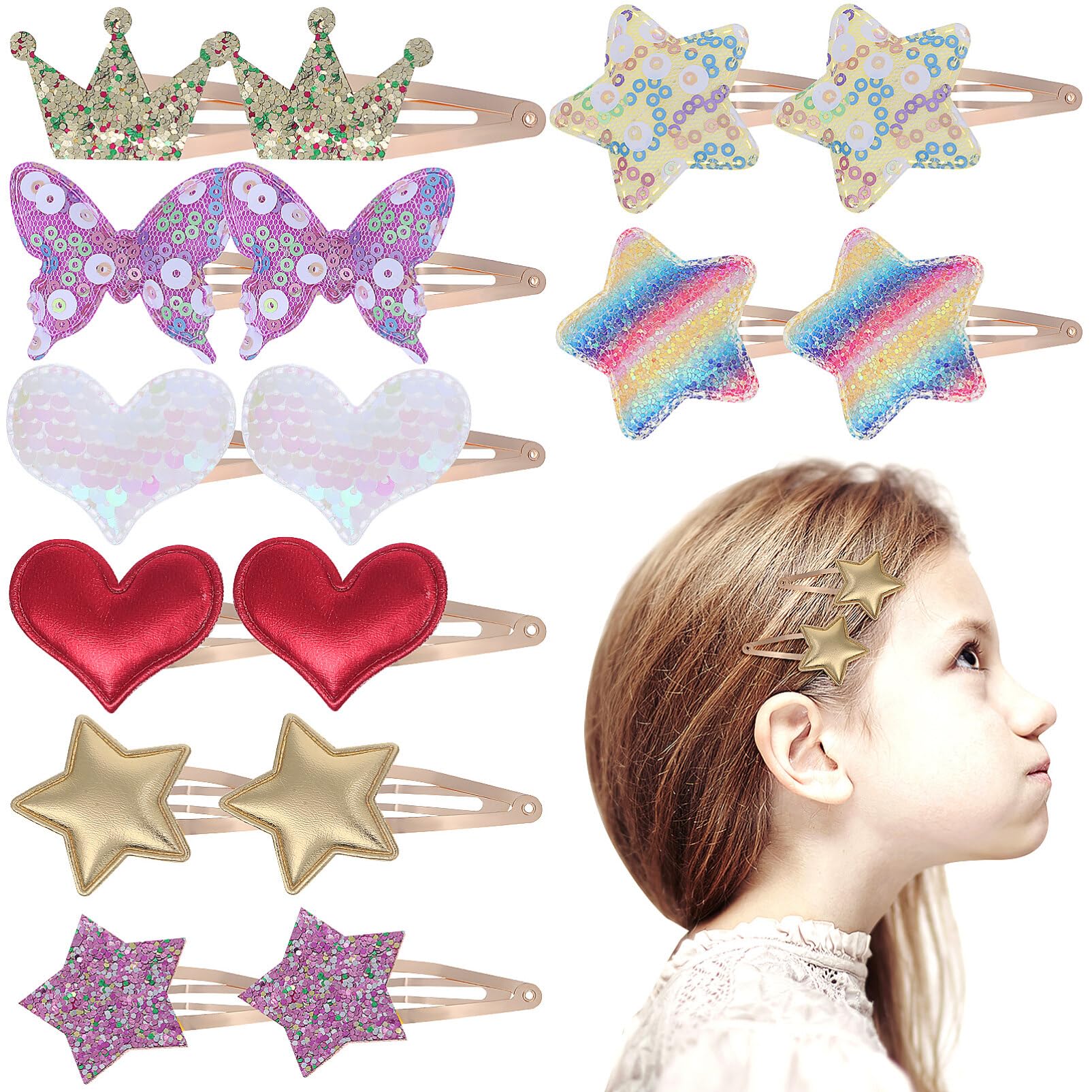 Cartoon and cute: these cute hair clips are perfect for little girls who like to shine and sparkle. Add extra charm to your little girl with these sparkly hair clips. Versatile use: whether for Christmas or everyday life, these hair clips are a cute eye-catcher and hold hair back securely and comfortably. You can also use them as a birthday gift and Christmas gift. Material: made of high-quality materials, they are durable and safe for children. A great gift for girls who like to experiment with hair accessories. Various styles and colours: bright popular styles are suitable for all types of clothing, hair colour hairstyles. Make your little girl unique every day. Great value package: with 8 pairs in different designs, including stars, crowns, butterflies and hearts, there is the right accessory for every occasion.