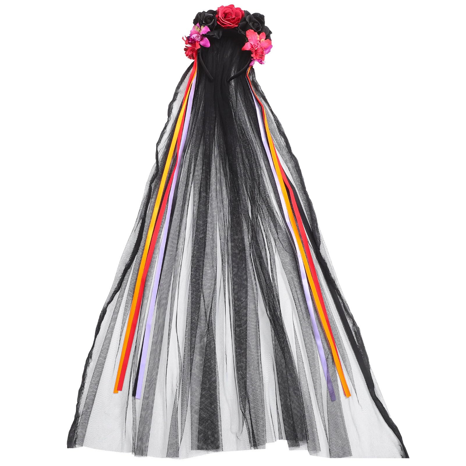 Beaupretty Halloween Rose Headband Flower Veil Headband Skull Hair Band Day of The Dead Headpiece Mexican Flower Headband Multi
