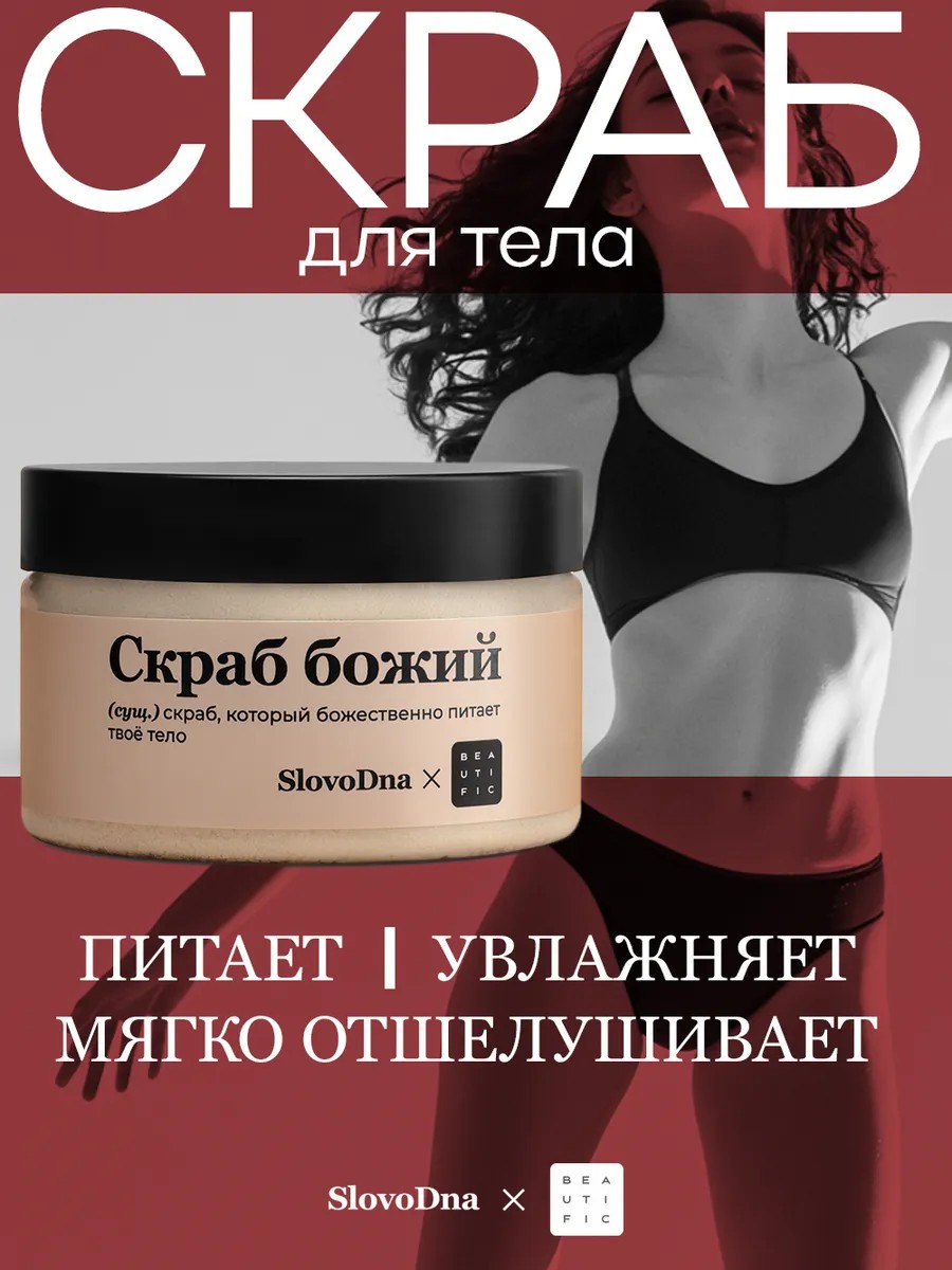 Крем-скраб для тела «Скраб божий» — часть коллаборации бьюти-бренда BEAUTIFIC и SLOVODNA — проекта Кирилла Караваева, создателя и идейного вдохновителя компании по производству мерча и бренд-магазина креативных товаров KIRILL KARAVAEV.