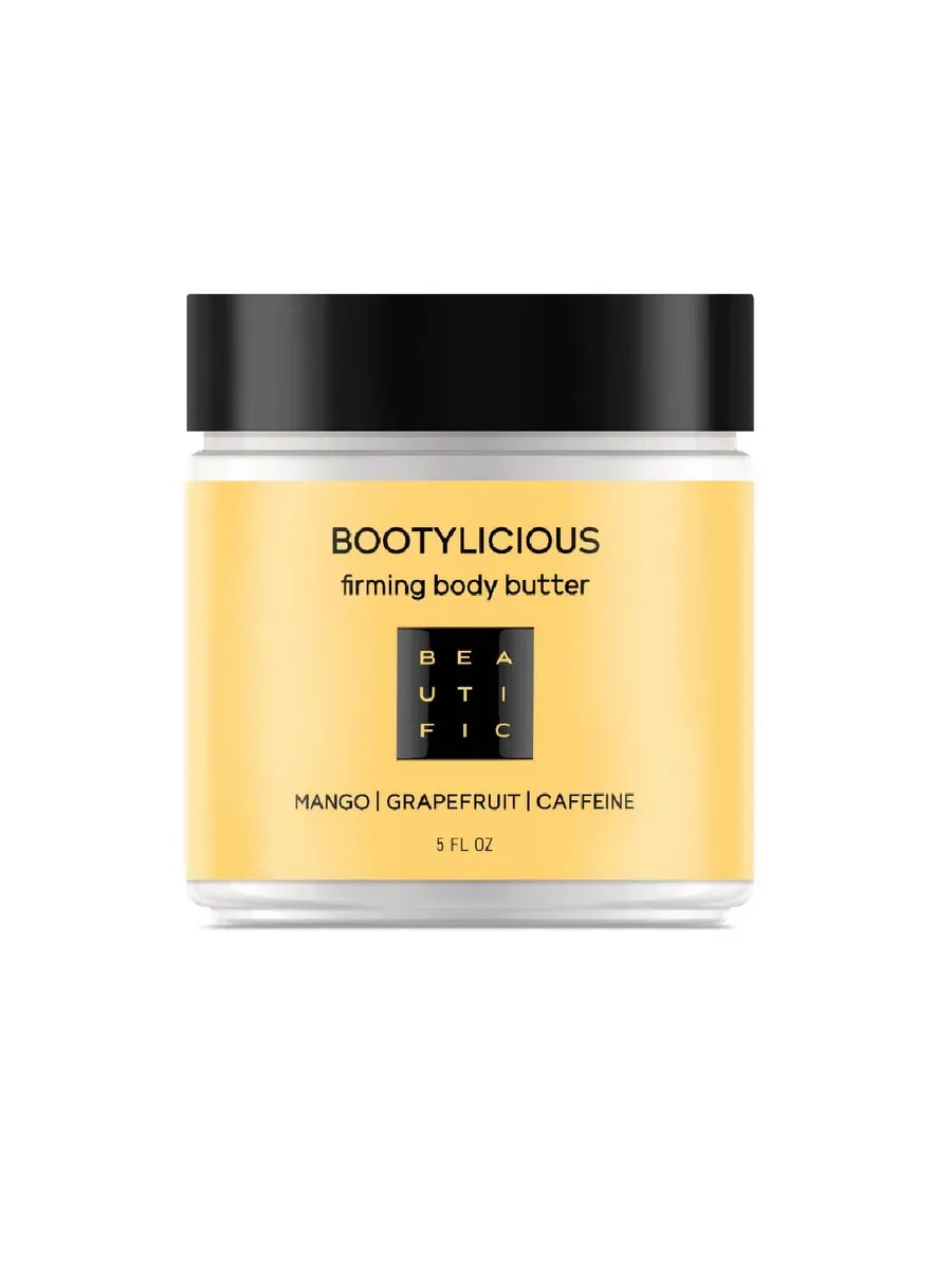 Beautific. Bootylicious Sculpting Body Butter, 300 ml. Enjoy your body with BOOTYLICIOUS! This grapefruit and caffeine butter helps reduce the appearance of cellulite. Mango, jojoba, shea, and sweet almond oils moisturize and smooth the skin, restoring elasticity and radiance. Panthenol eliminates dryness and tightness, softening and soothing the skin. The delicate texture absorbs quickly without stickiness or greasiness, and the juicy scent of fresh mango sets a sunny mood all day long!