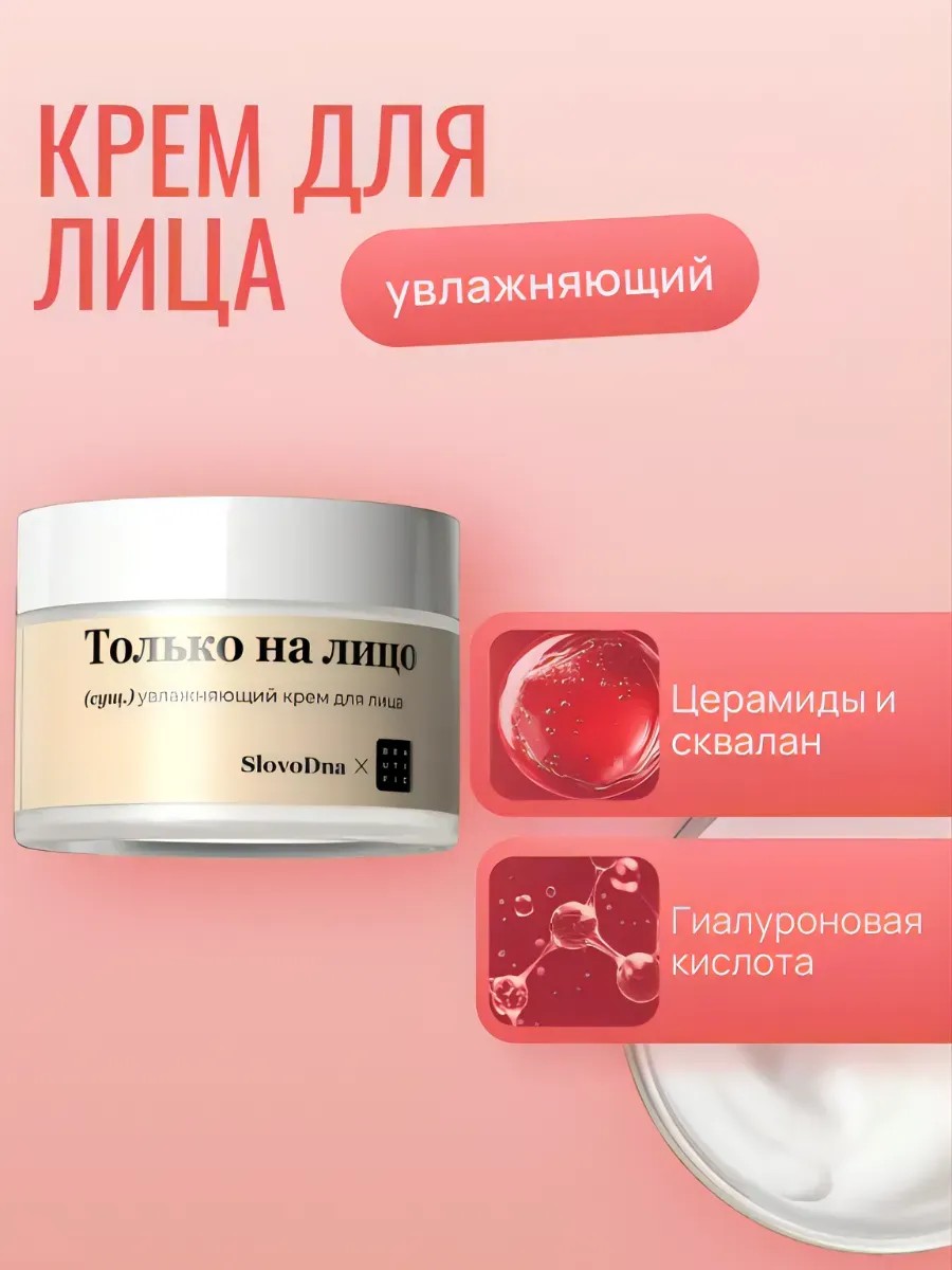 Увлажняющий крем для лица «Только на лицо» — часть коллаборации бьюти-бренда BEAUTIFIC и SLOVODNA — проекта Кирилла Караваева, создателя и идейного вдохновителя компании по производству мерча и бренд-магазина креативных товаров KIRILL KARAVAEV. С уходовой косметикой от BEAUTIFIC и SLOVODNA в твою привычную заботу о красоте ворвутся стильный юмор и креатив.