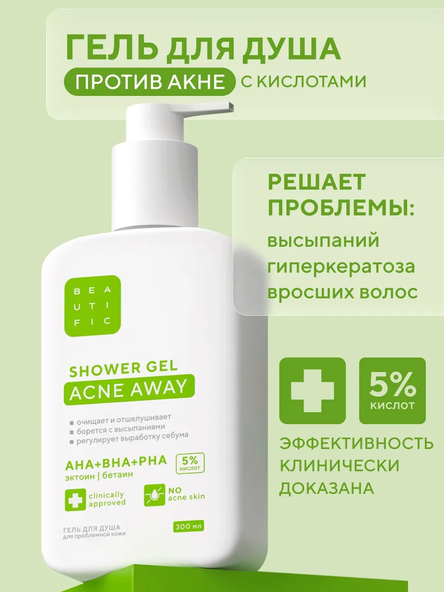 Гель для душа с кислотами BEAUTIFIC ACNE AWAY: эффективное очищение и уход для кожи с высыпаниями