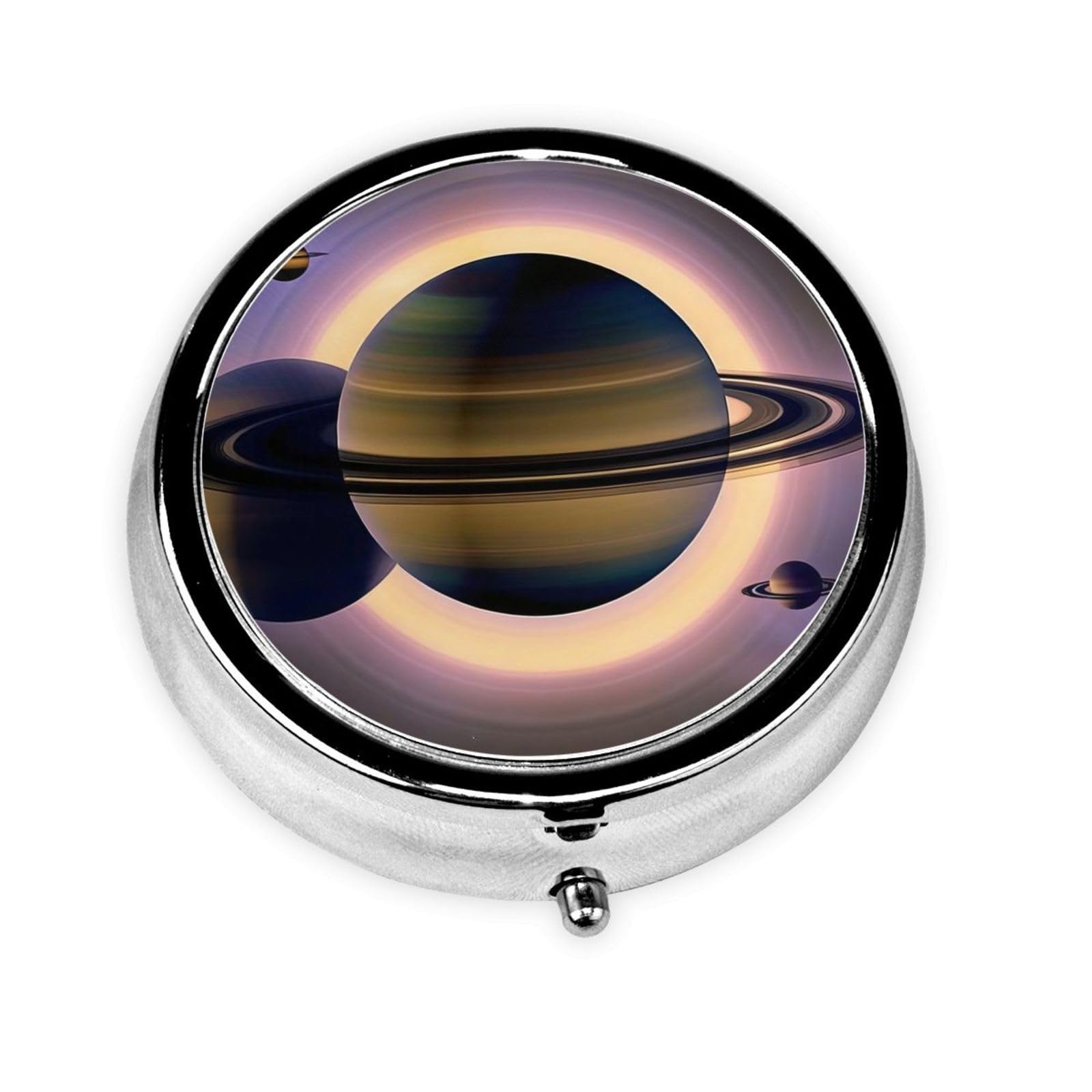 Beautiful Saturn Portable Metal Pill Box Round Mini 3-Compartment Plastic Insert hinged Fastening Design Suitable for Small Pills Must-Have for Travel