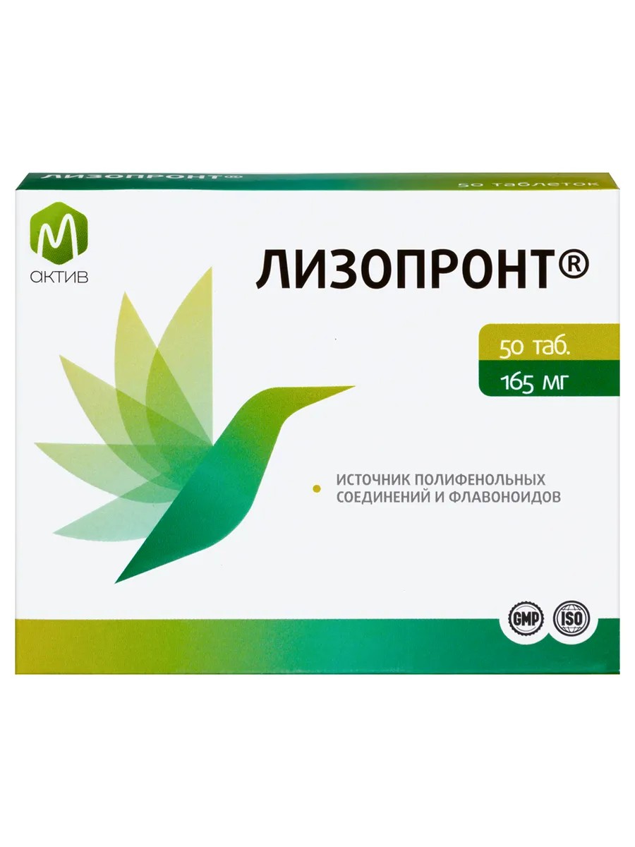М АКТИВ ЛИЗОПРОНТ - Таблетки круглые, двояковыпуклой или плоскоцилиндрической формы светло-серо-голубого цвета. Содержание в 1 таблетке Флавоноиды (в пересчете на рутин) не менее 1 мг Полифенольные соединения (в пересчете на галловую кислоту) не менее 5 мг Активные компоненты: Околоплодник грецкого ореха и цветки ромашки, используемые для производства экстрактов, содержат витамин С, который проявляет антиоксидантное действие и способствует иммунной регуляции. Помимо этого, в их состав входят флавоноиды (рутин), которые также присутствуют в траве хвоща. Они проявляют антиоксидантную активность, обладают противомикробным действием и способствуют сохранению витамина С в организме. Алтей - лекарственное растение, название которого, согласно греческим легендам, происходит от слова Althaca - «исцелять». Высокое содержание слизей в его корнях обуславливает его благотворное влияние на верхние дыхательные пути. Обладая обволакивающим действием, слизи способствуют образованию и восстановлению слизистых покровов. Трава тысячелистника и цветки ромашки содержат эфирное масло, которое обуславливает особый запах растения. Эфирные масла обладают успокаивающим и противовоспалительным действием, воздействуя на организм мягко и постепенно. Латинское название тысячелистника - Achilléa - вероятнее всего, происходит от имени персонажа древнегреческой мифологии Ахиллеса, который, по преданиям, использовал это растение для лечения ран. Кора дуба является источником дубильных веществ, представляющих собой смесь различных полифенолов, одним из главных представителем которых является галловая кислота. Дубильные вещества проявляют вяжущие и противовоспалительные свойства: взаимодействуя с белками микроорганизмов, они способствуют остановке их роста или приводят к гибели. Одуванчик - многолетнее травянистое растение, о полезных свойствах которого известно уже очень давно. В качестве сырья для изготовления экстрактов используются корни, в которых обнаружено множество активных соединений, основными из которых являются бета-ситостерин (вещество, проявляющее антиоксидантные свойства) и тараксастерол, обладающий противовоспалительным эффектом.